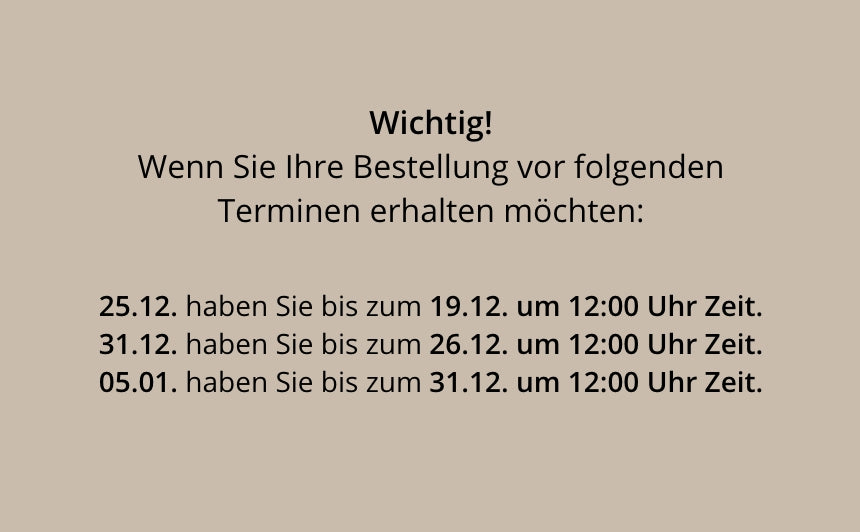 Bestellungen, die zwischen dem 24.12 (mittags) und dem 28.12 aufgrund der Feiertage aufgegeben werden, werden ab dem 29.12 versendet
