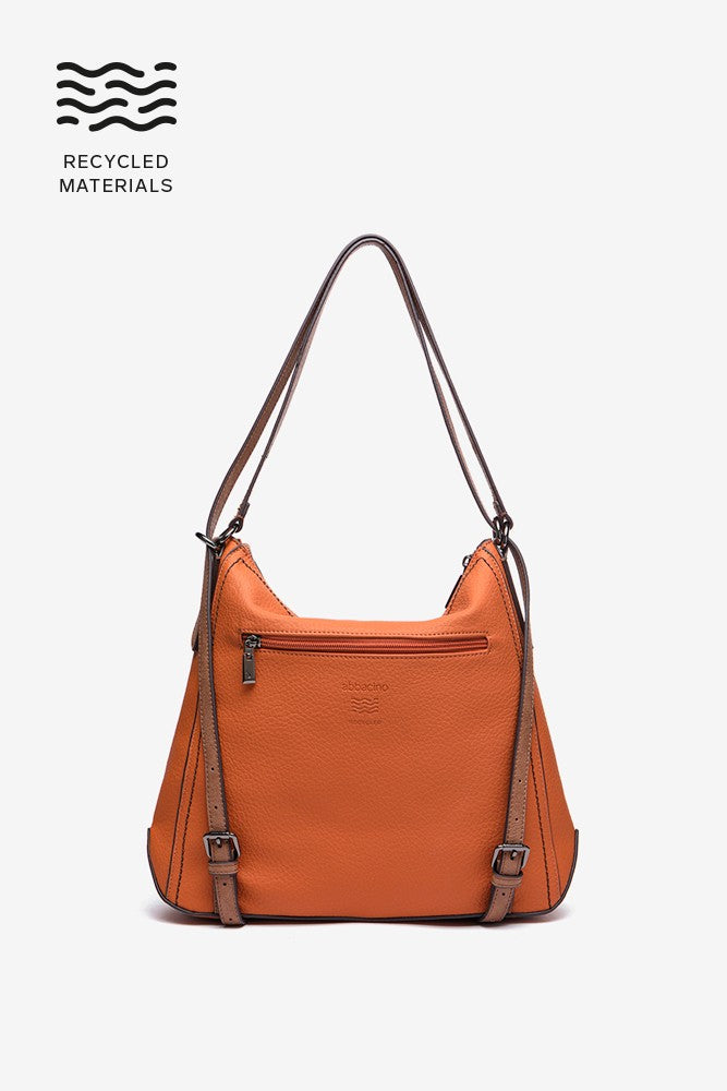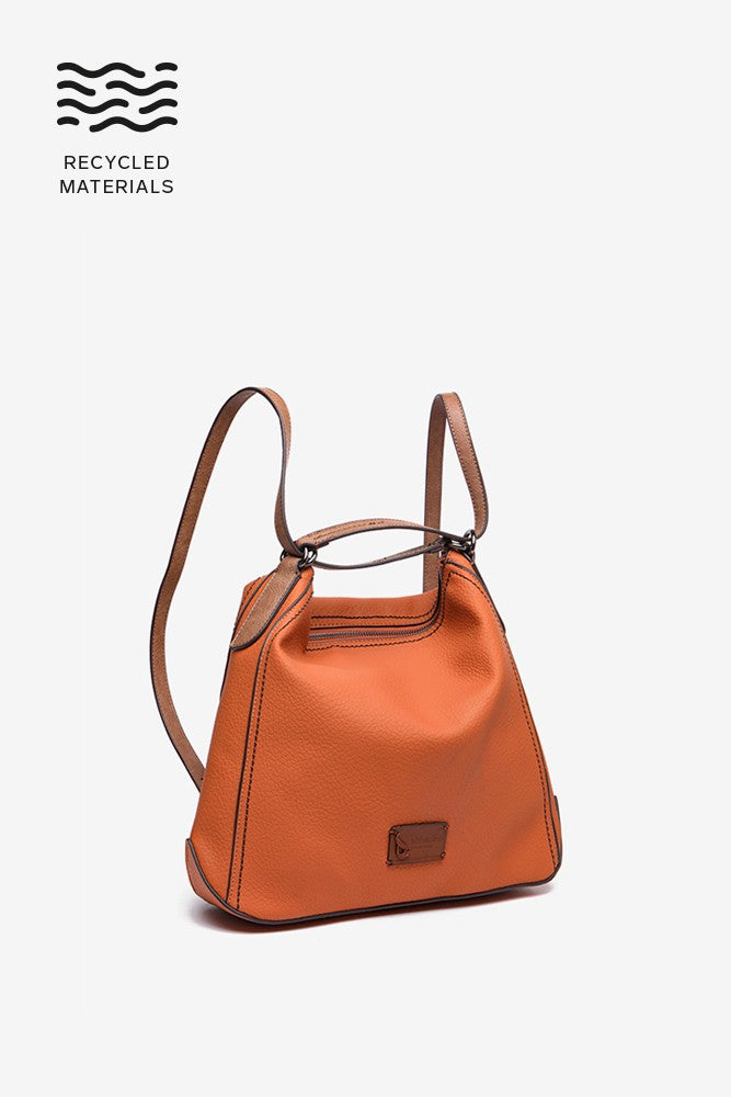 Women's bag convertible into a backpack made from recycled materials. Classic, simple and timeless, this design will become an everyday essential thanks to the simplicity of its lines, its multifunctionality and its autumnal colours. It features leather-coloured details, such as its handles or a small patch with the brand's logo, which stand out against the bag's main colour.