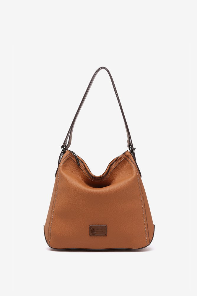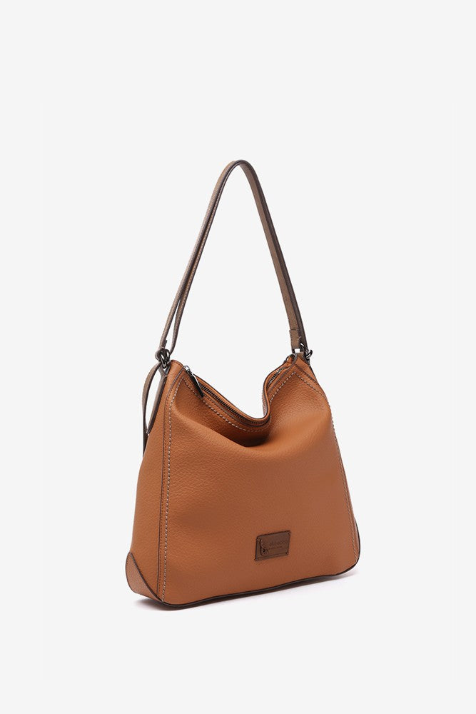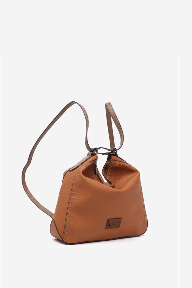 Convertible women's bag into a backpack made from recycled materials. Classic, simple, and timeless, this design will become a staple in your daily life thanks to the simplicity of its lines, its multifunctionality, and its autumnal colors. It features leather-like details, such as its handles or a small patch with the brand logo, which stand out against the main color of the bag.