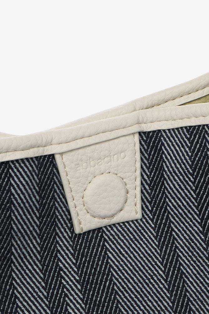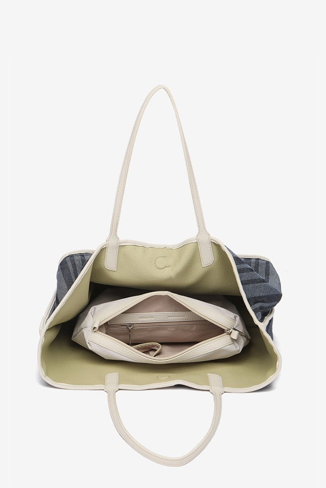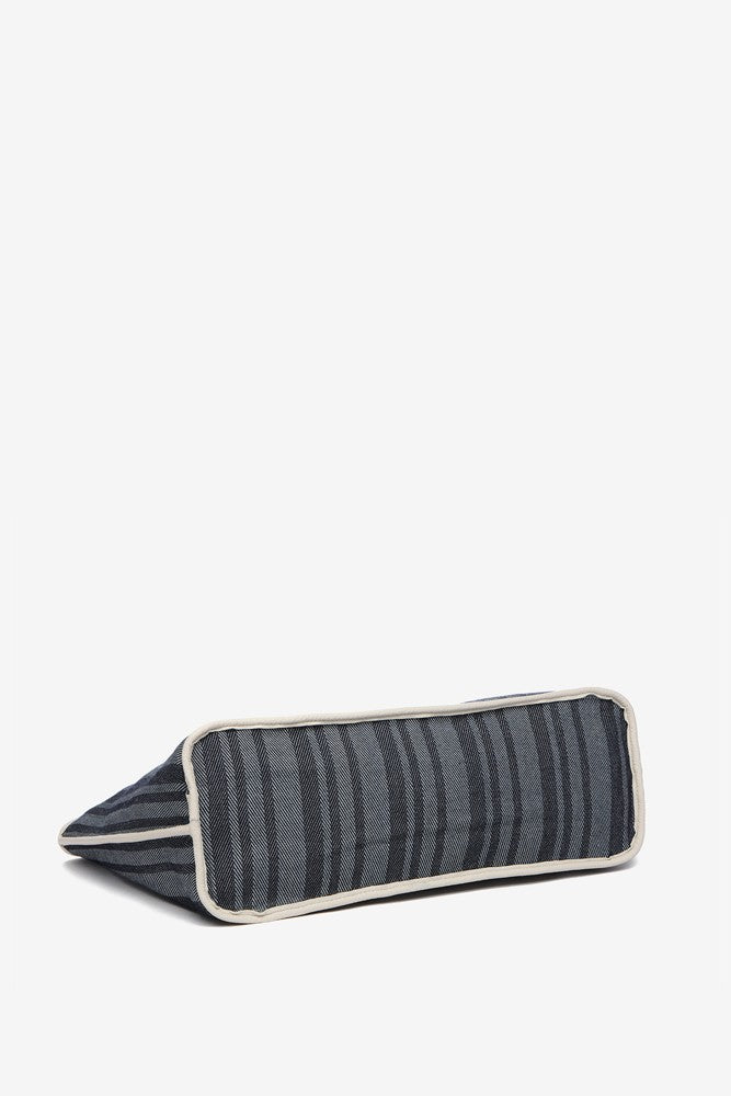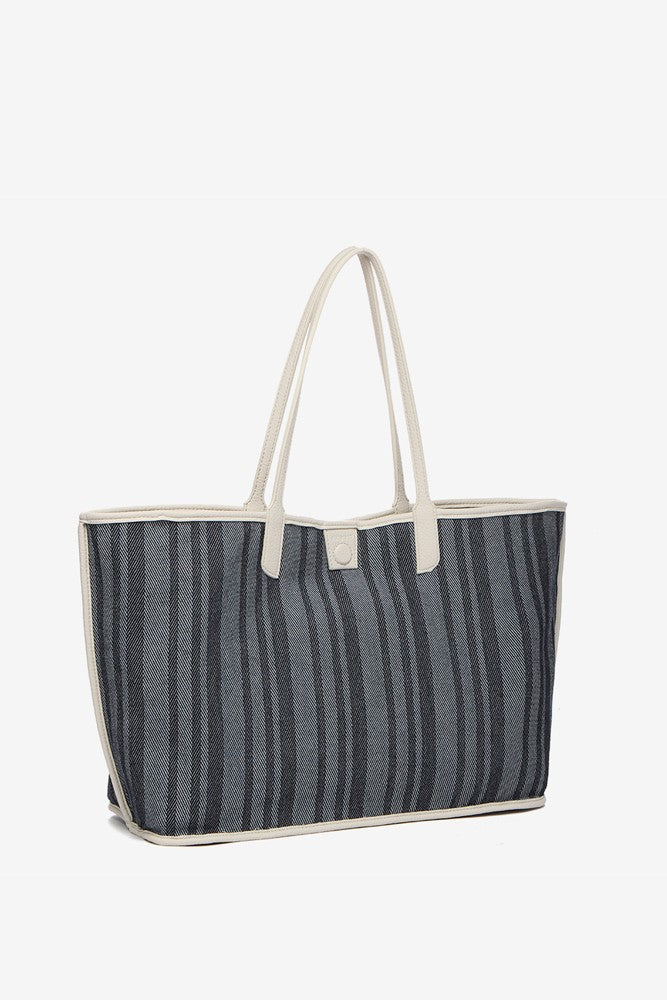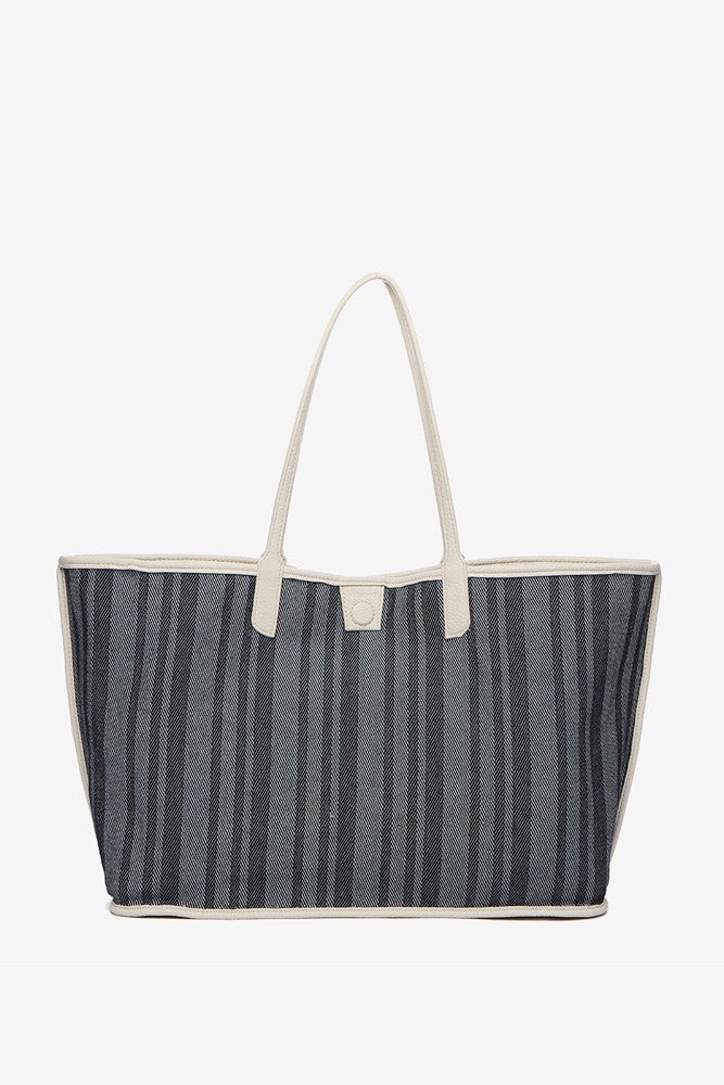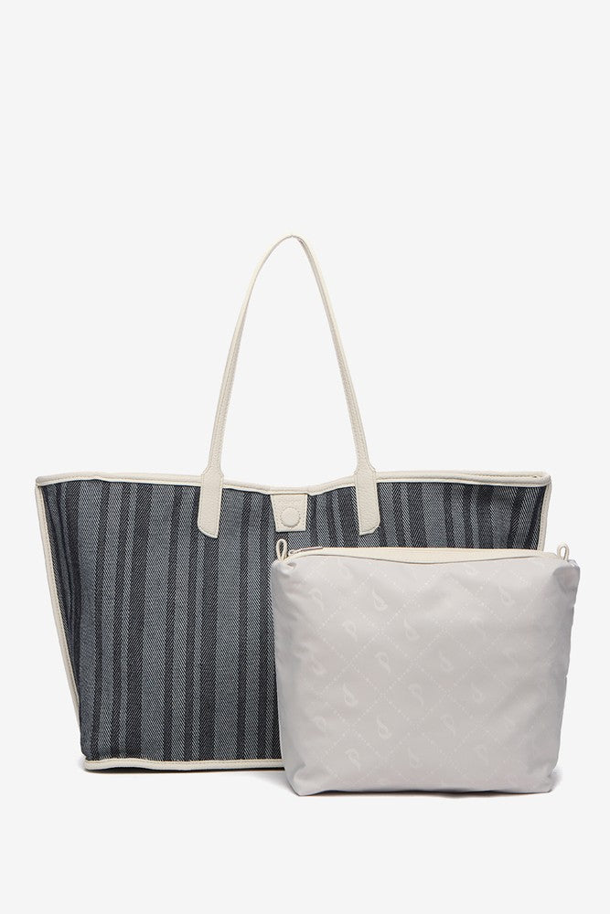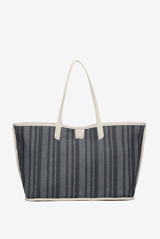 Women's large capacity shopper bag crafted from synthetic materials. This bag has the particularity of being reversible: on one side, it features a solid color, on the other, a beautiful linear sailor-style pattern. Its main features include:
