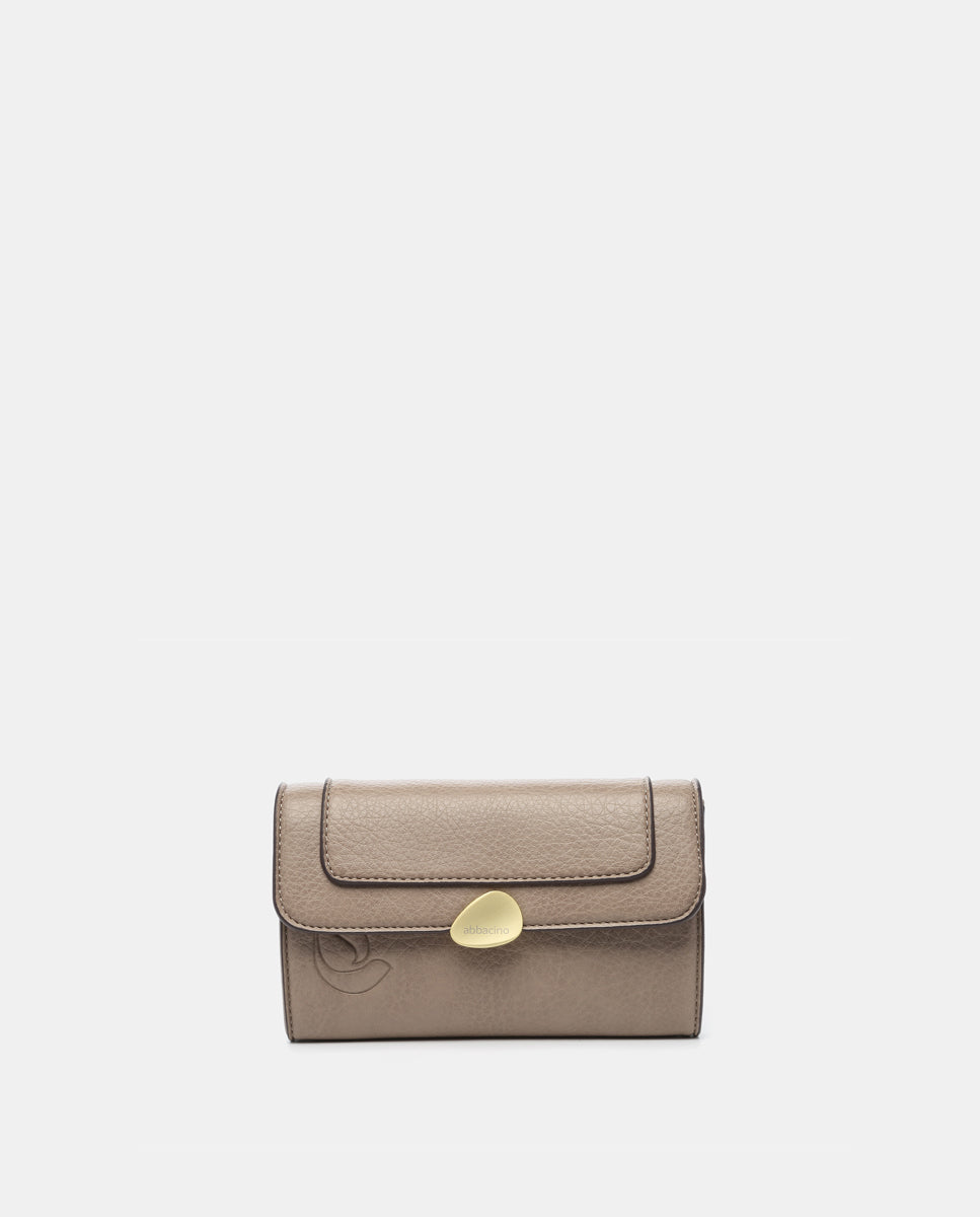 • Front flap closure with gold-tone metallic appliqué.