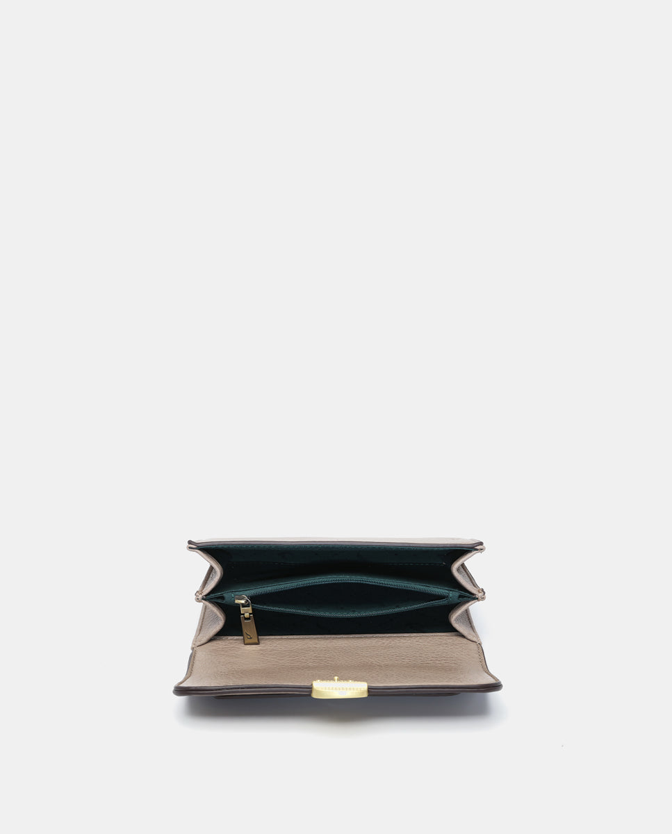 Women's crossbody bag made from recycled materials. An innovative model in our collection that is characterised by its rigid texture and its front flap closure, on which a metallic appliqué stands out. This classic and elegant design is perfect for those who are looking for a very feminine and chic accessory.