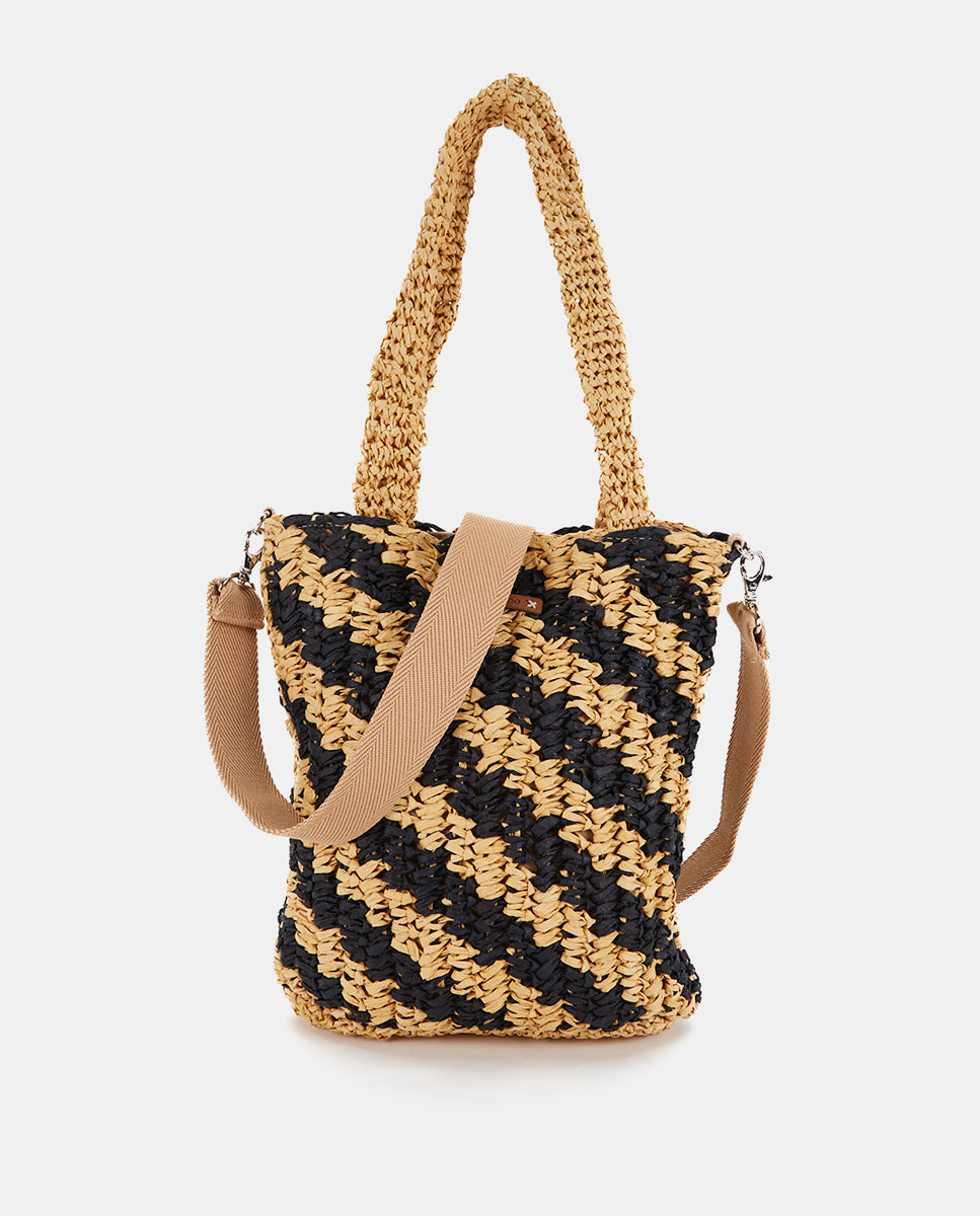 Women's handbag crafted from woven natural fibers with a linear contrast print in black. A perfect design to add a carefree and very trendy touch to your summer looks. Its key features are: