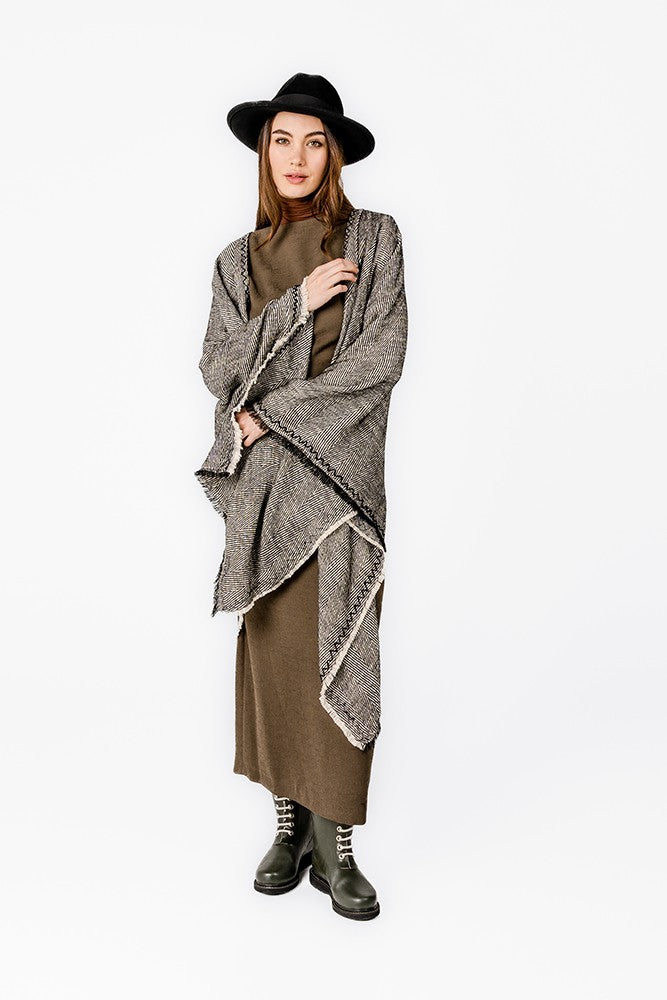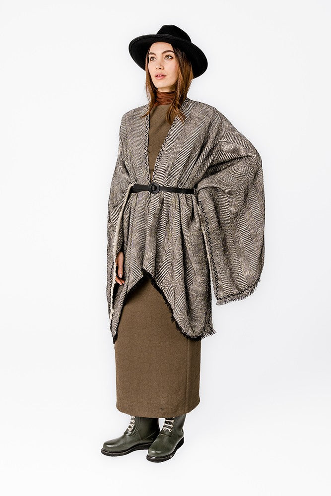 Women's poncho with linear print in an elegant and sober style. Its fabric is ultra-soft to the touch and very warm, perfect for autumn and winter days. Its ends are frayed, and as an original detail, we can see the visible zigzag seams. A very easy to combine accessory and perfect to accompany you in the colder months. One size.