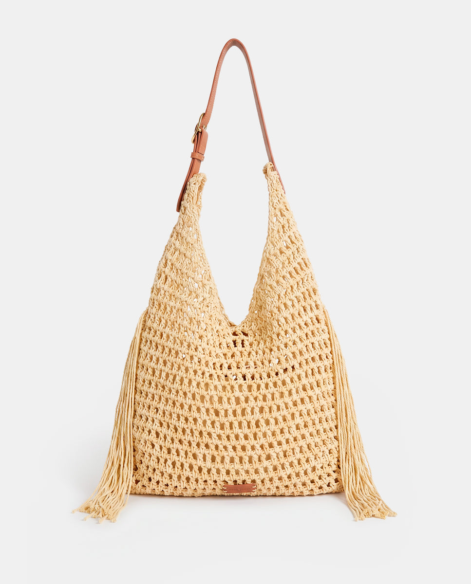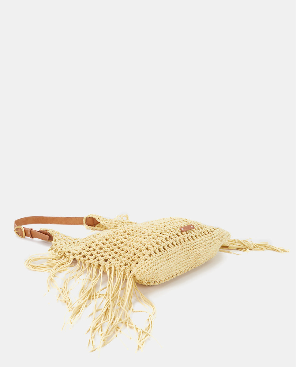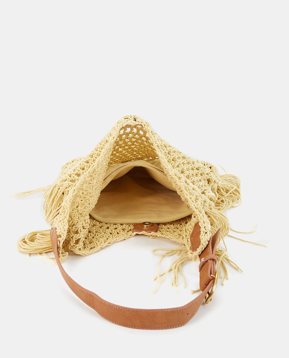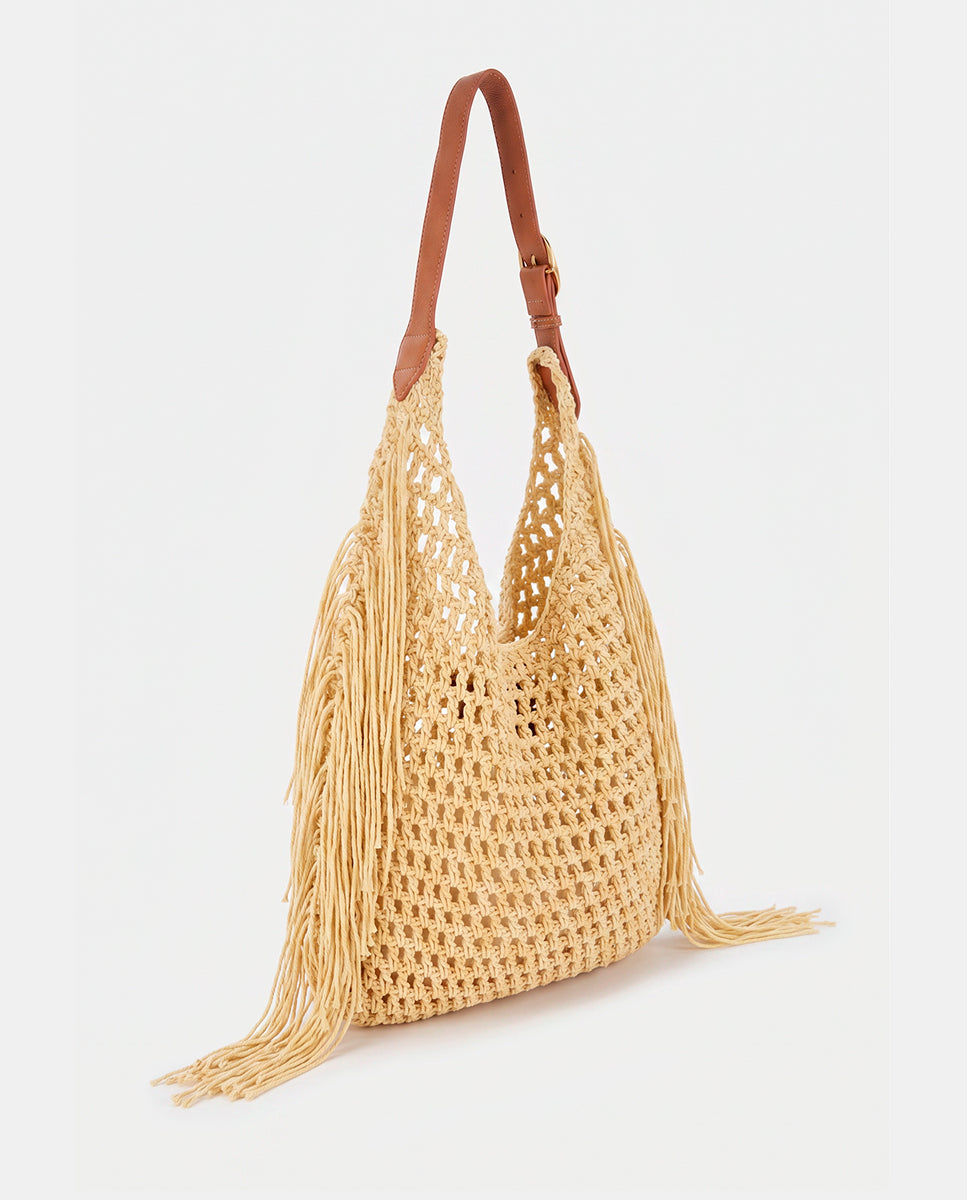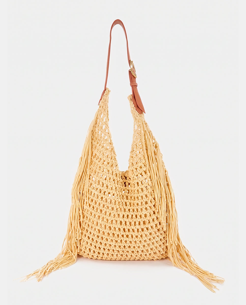 Shoulder bag made from macramé with decorative fringes, adding an artisanal and relaxed boho-chic style. Its main features are: