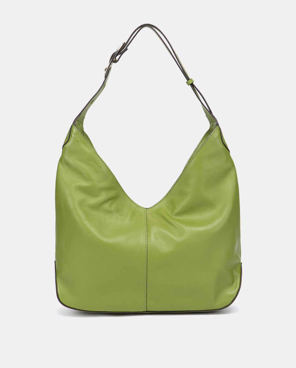 Hobo-style shoulder bag made of smooth leather and suede with soft lines and a wide, relaxed silhouette. Its main features are:
