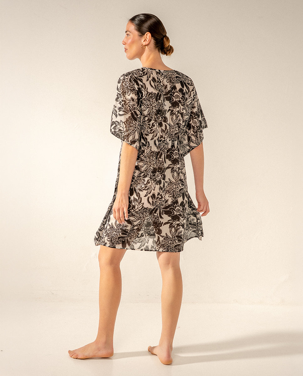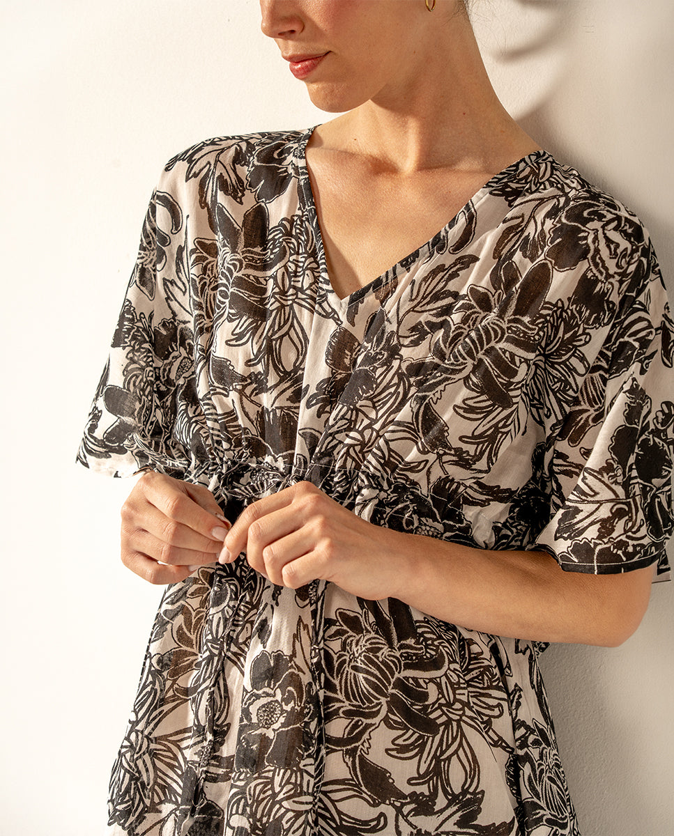 Women's caftan made from cotton with a floral print. Its fabric is very loose and soft to the touch, making it a perfect accessory for the hottest days of the year. Features a flattering V-neck and a waist tie to enhance the silhouette.