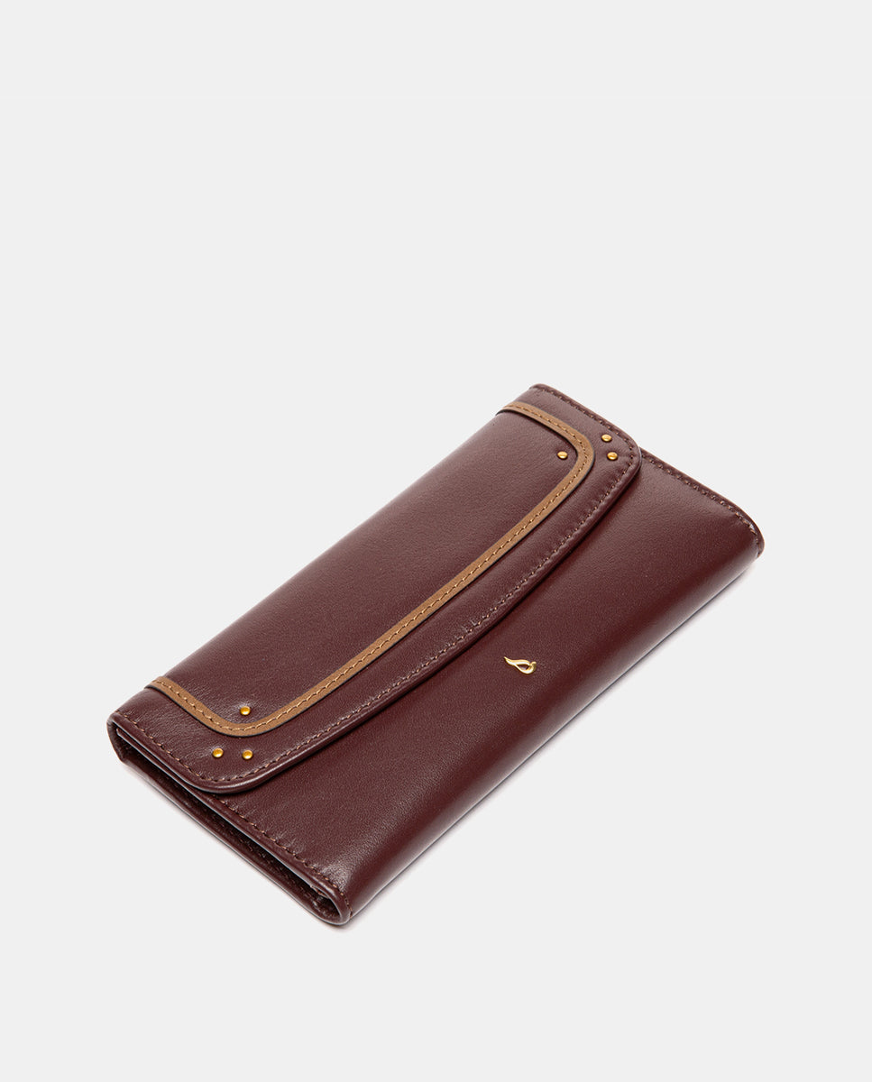 Large women's wallet made of premium leather, distinguished by its flap closure and a contrasting colored stripe. Elegant and functional, it's ideal for those looking for both storage and style. Its main features include: