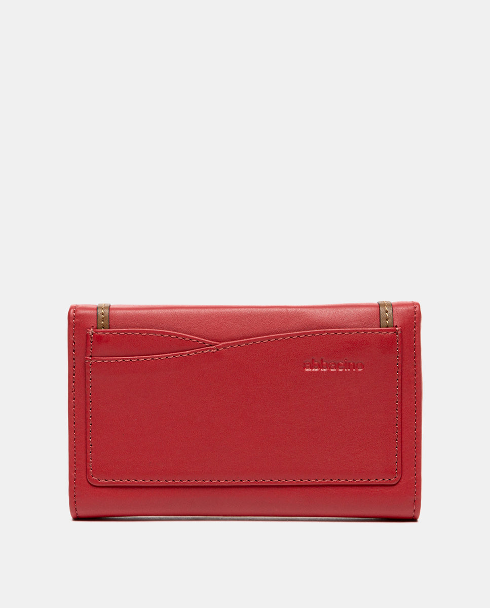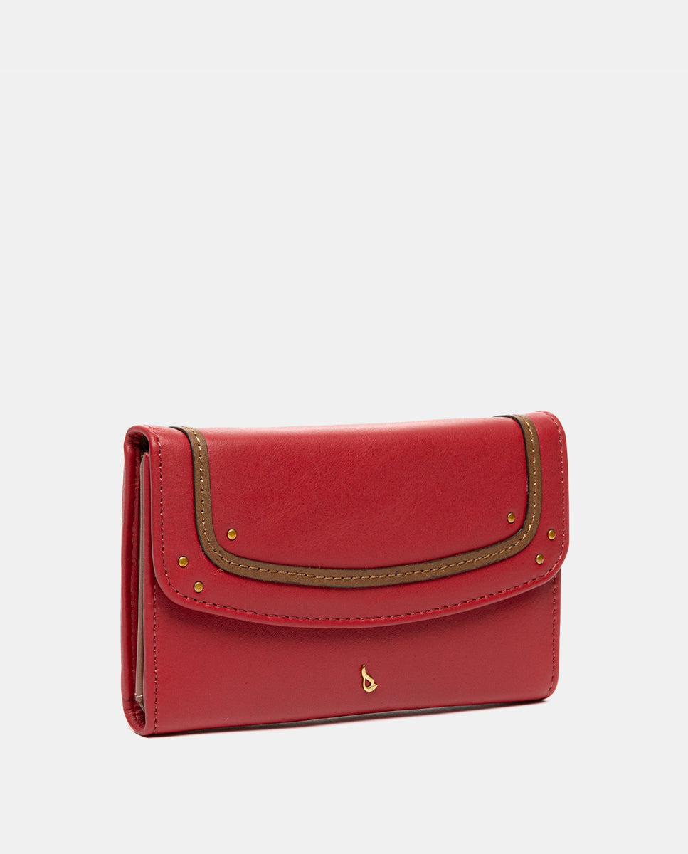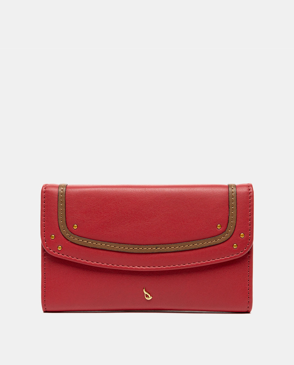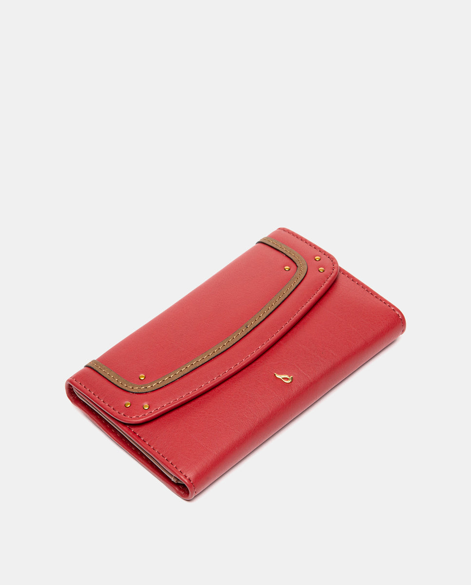 Women's medium-sized wallet made of premium leather, distinguished by its flap closure and contrasting color stripe. Elegant and functional, perfect for everyday use. Its main features are: