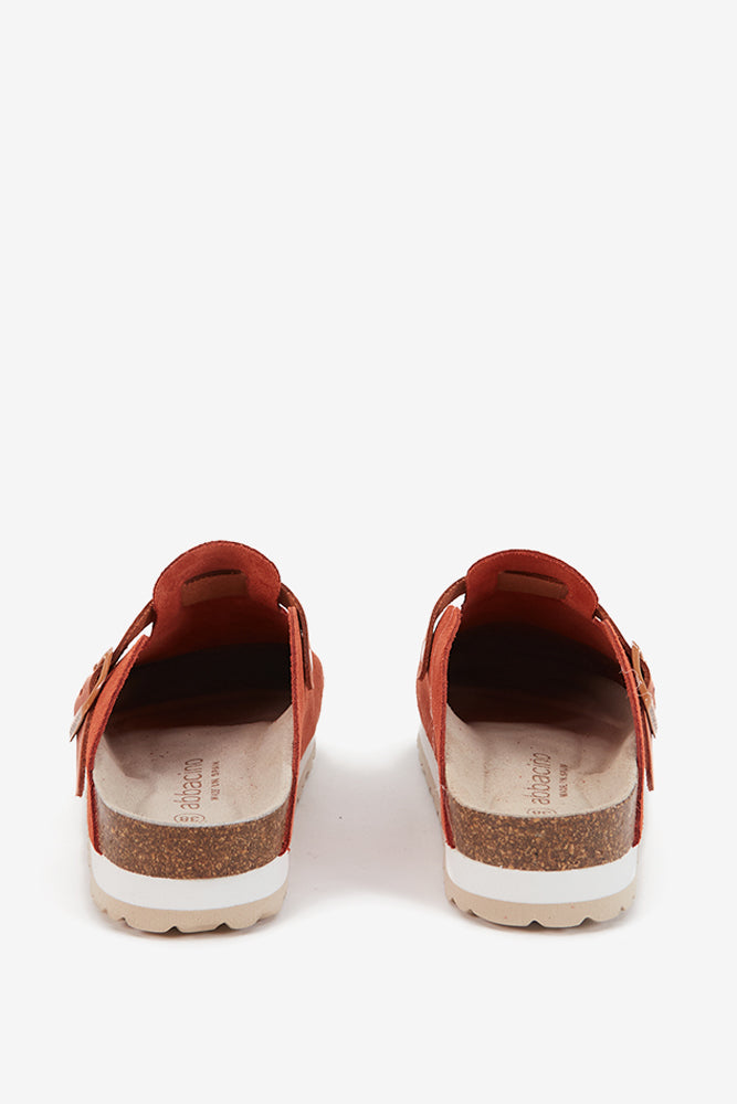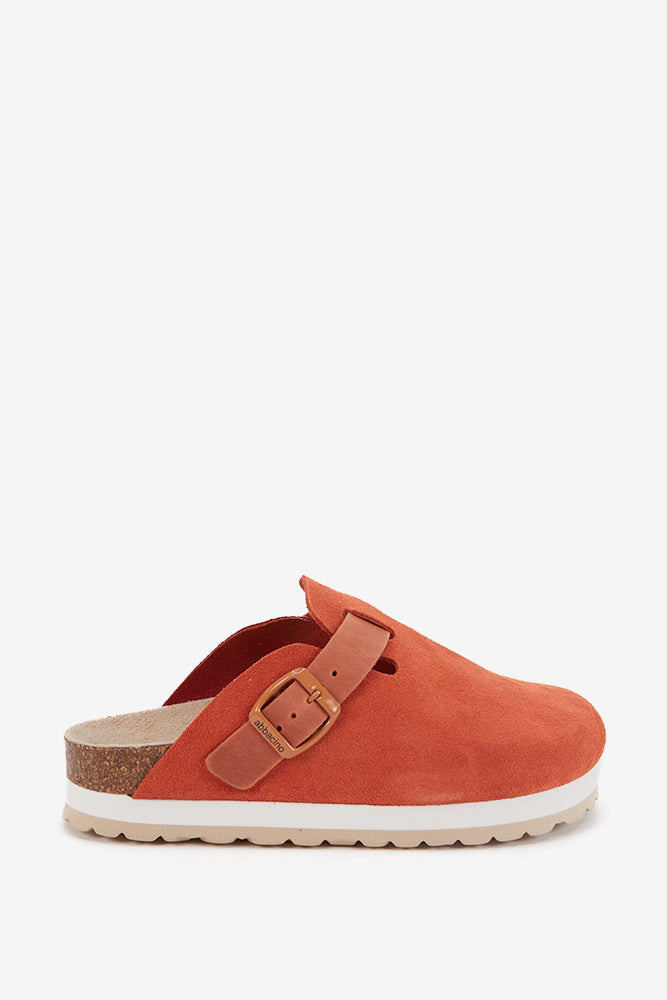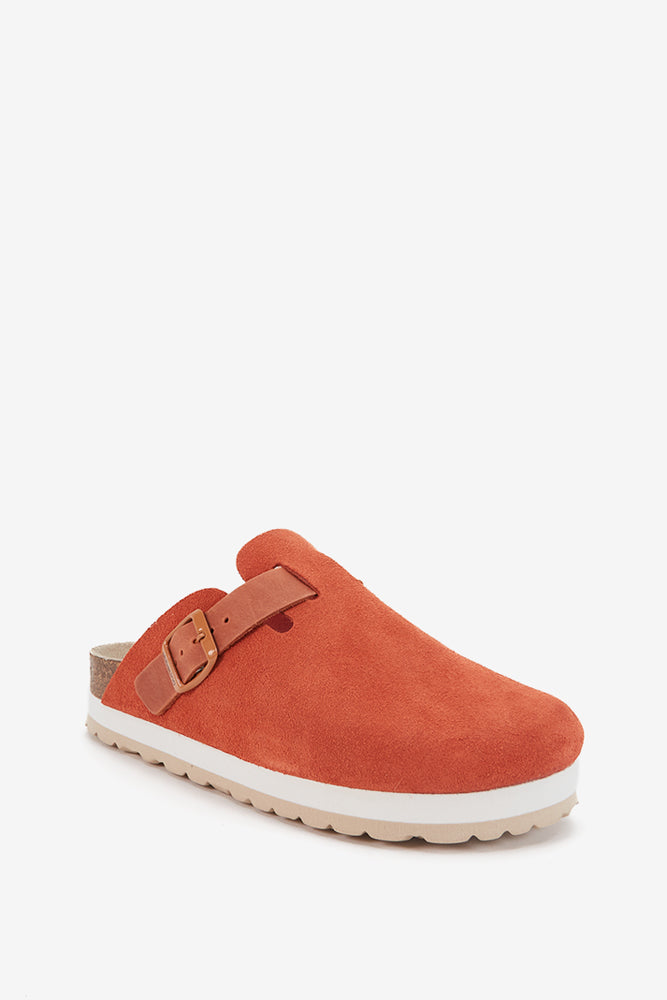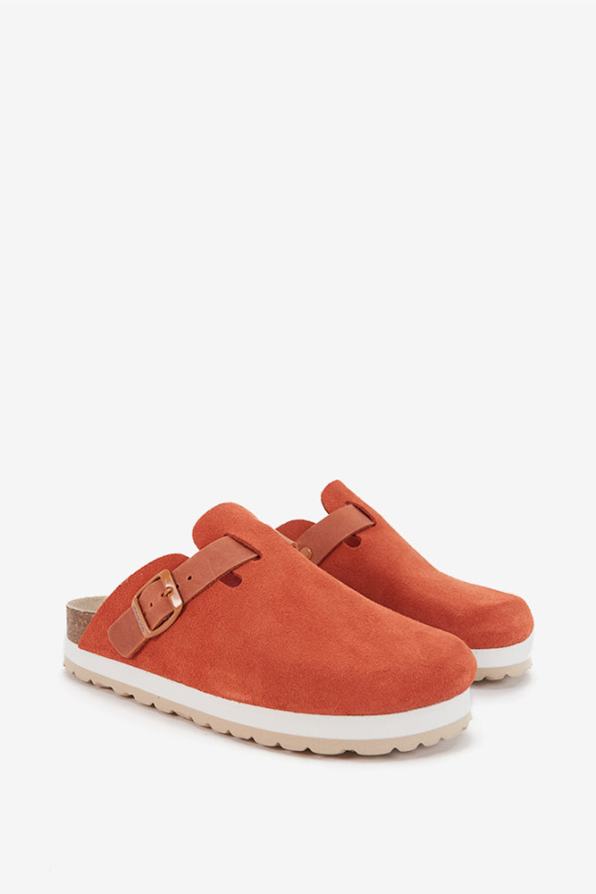 Women’s platform suede clog with buckle. A classic and timeless design made with high-quality materials. Its minimalist and versatile aesthetic makes it an ideal option for daily wear, offering both style and comfort with every step. The insole adapts to the natural contour of the foot, providing excellent arch support and optimal cushioning. (EVA sole).
