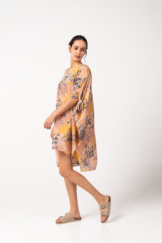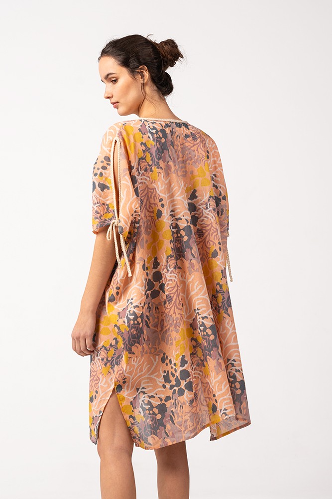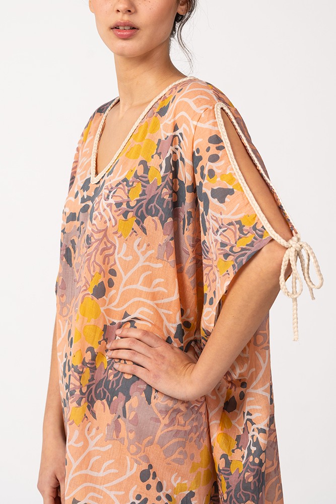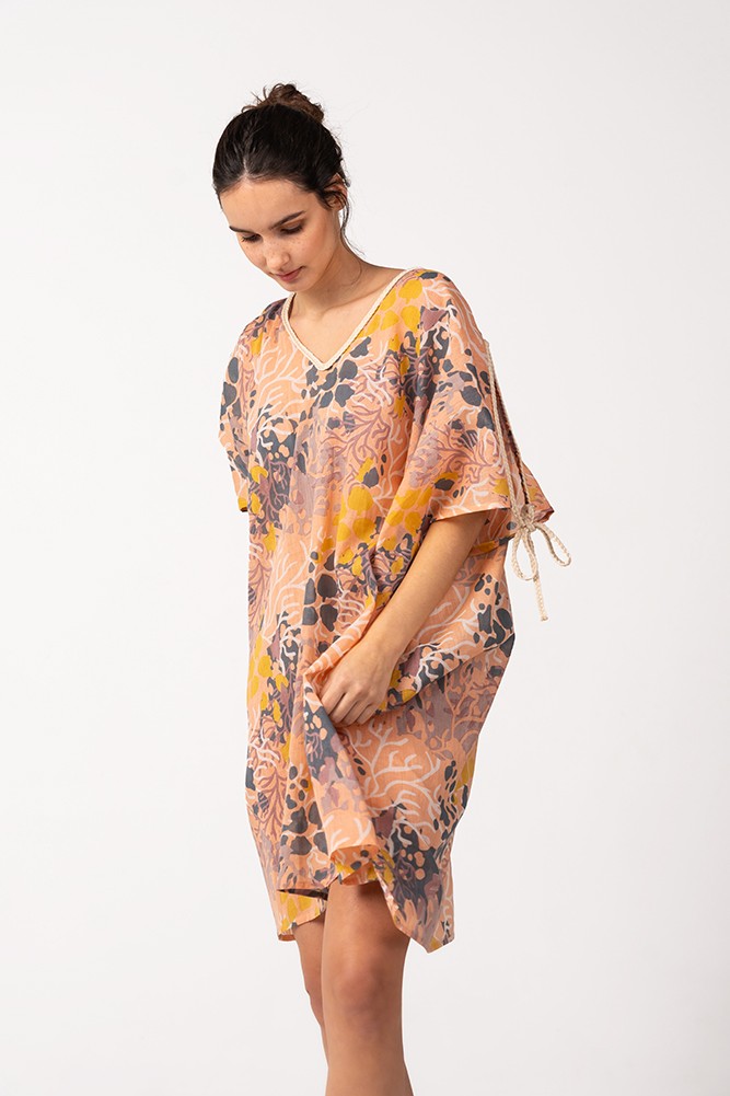 Women's kaftan made of cotton with a beautiful print that simulates the seabed. Its fabric is very loose and soft to the touch, making it a perfect accessory to accompany us during the hottest days of the year. As a small detail, it is worth mentioning the opening of the sleeves with a drawstring at the ends to tie them.