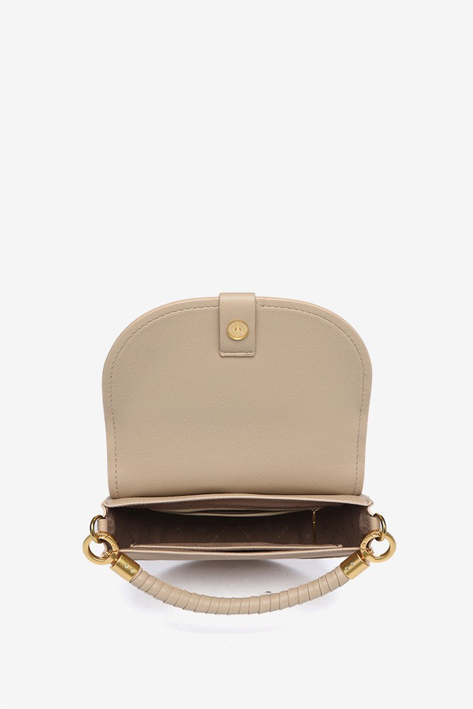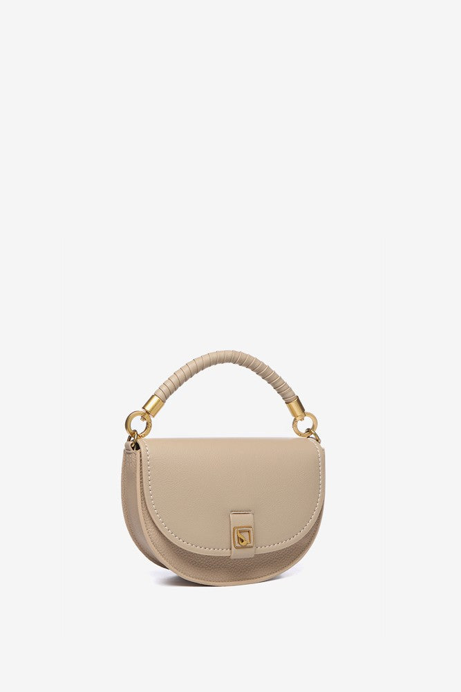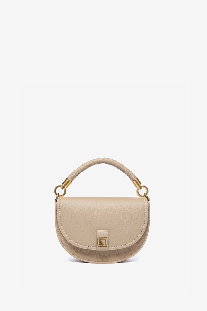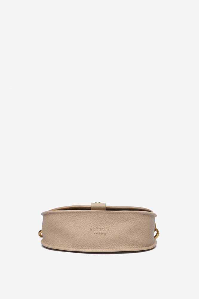 Women's crossbody bag in half-moon format made from recycled materials. A new silhouette in our catalog that follows the latest trends of the moment. Its youthful style, clean and simple lines, golden details, and range of colors make this accessory a very special design and a true gem this season. Its main features are: