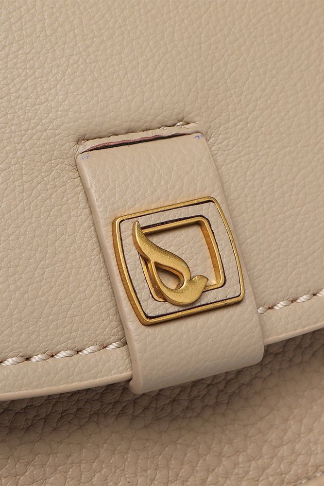 • Front flap closure with a metallic appliqué featuring the brand's logo.