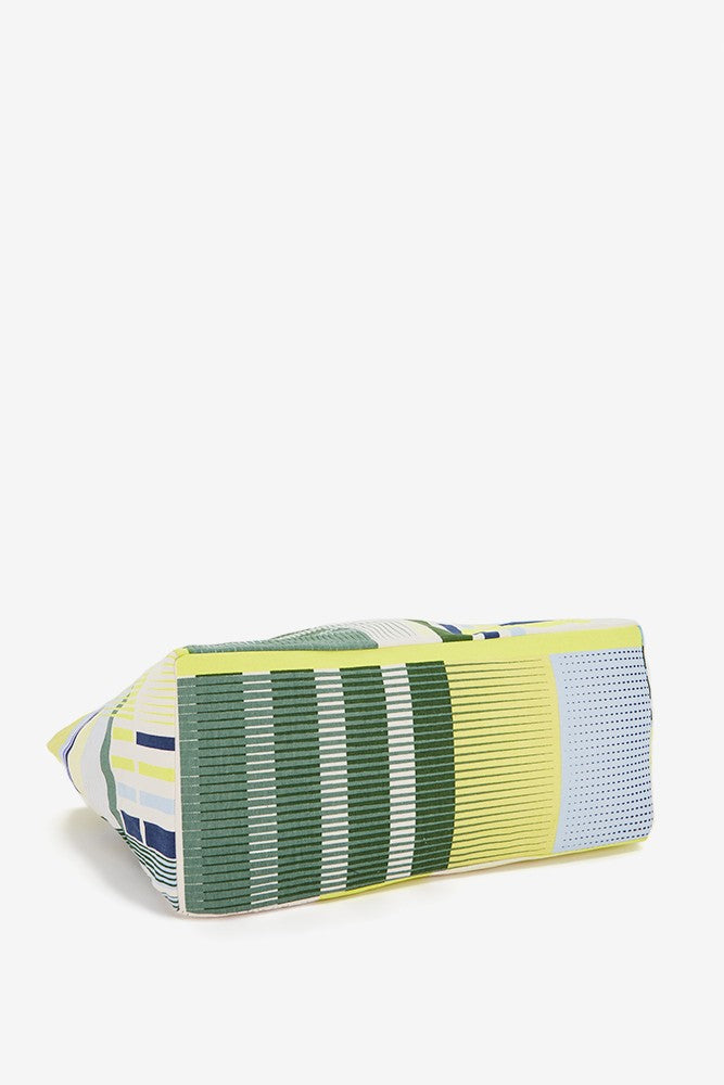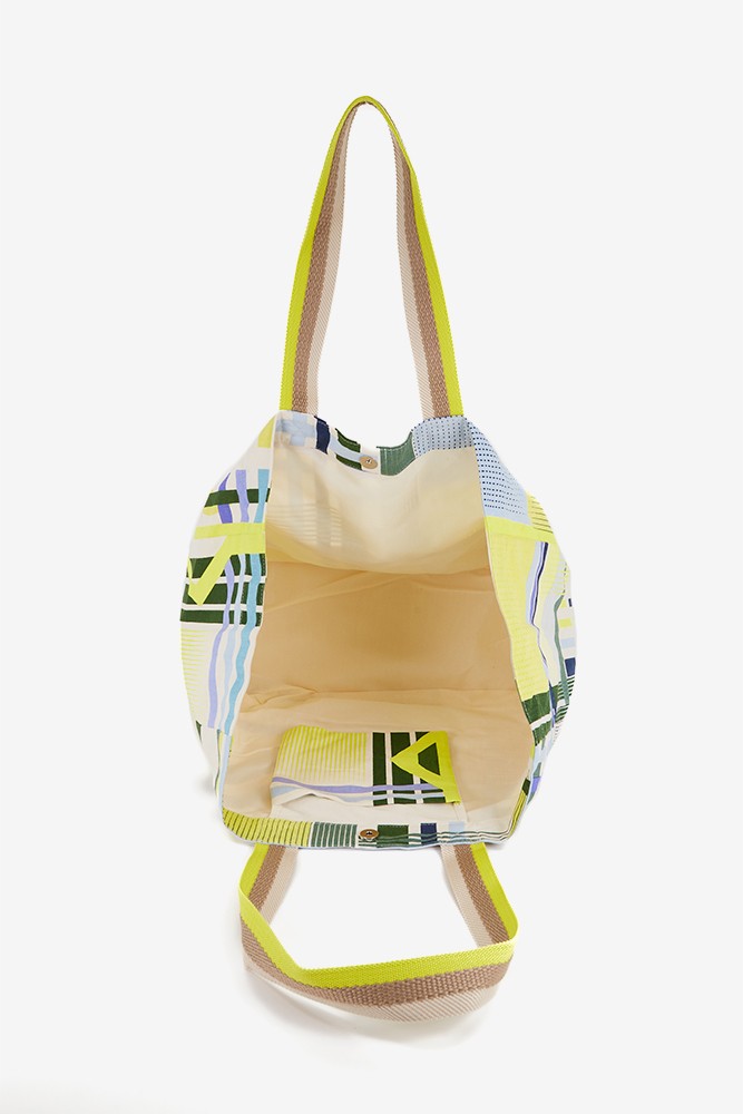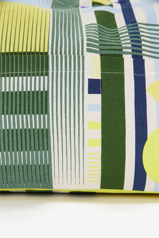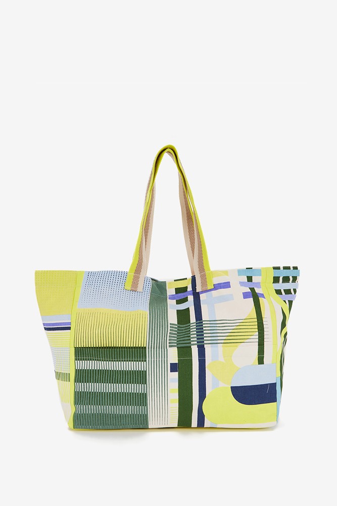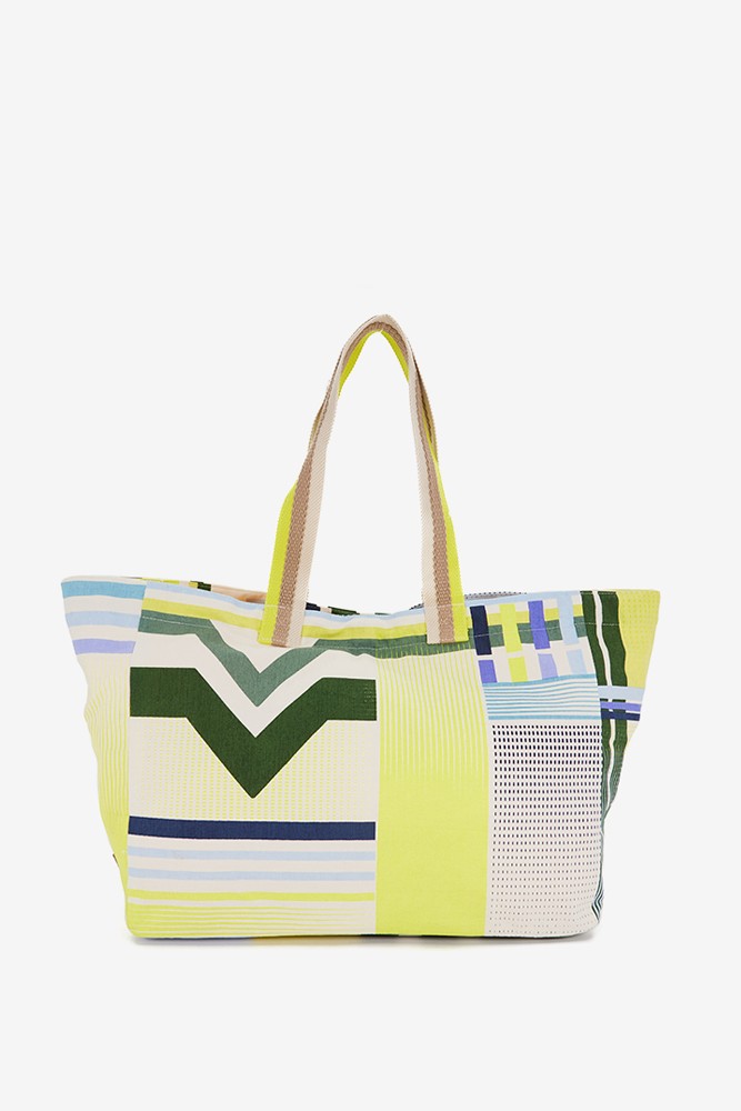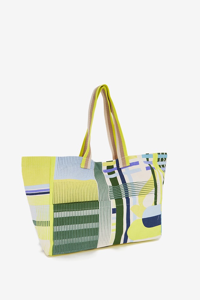 Large beach bag made of cotton. It features a loose fabric design and a striking full-color geometric print, ideal for sunny days at the beach. Its main features include: