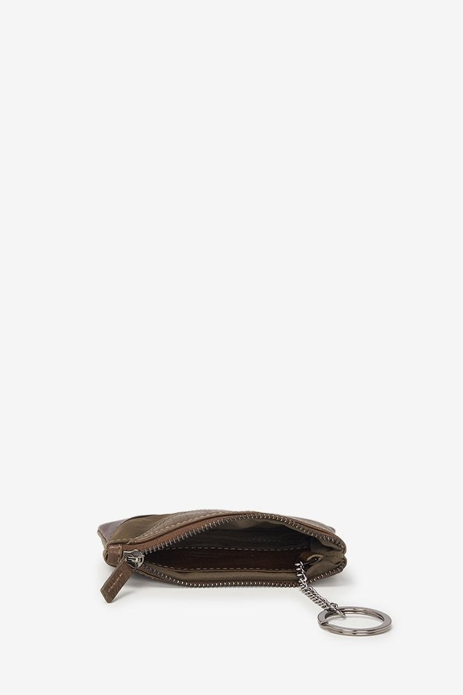 A high-end leather men's coin pouch. Handcrafted. A modern masculine design highlighted by the piece of canvas in the middle and the sophisticated range of colours. Zip closure. Engraved brand logo.