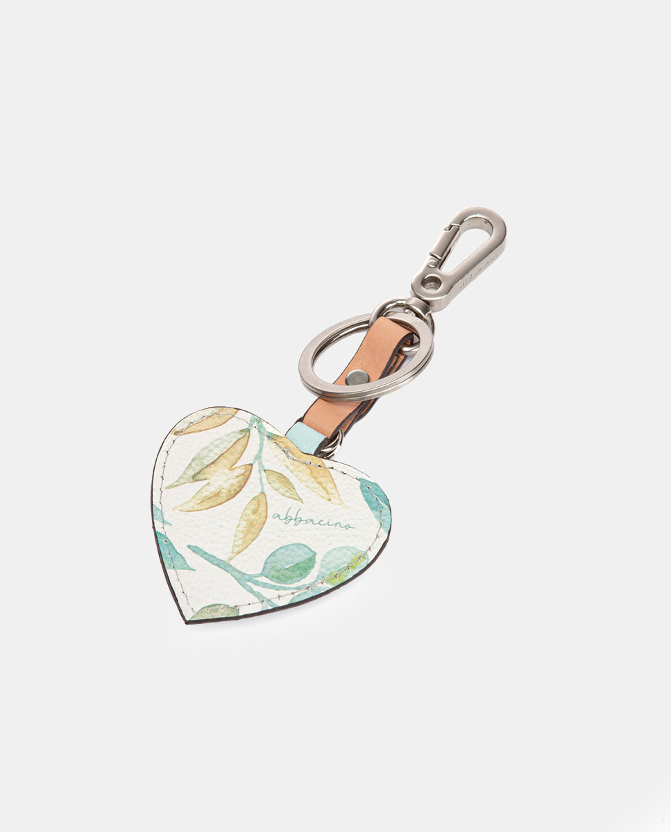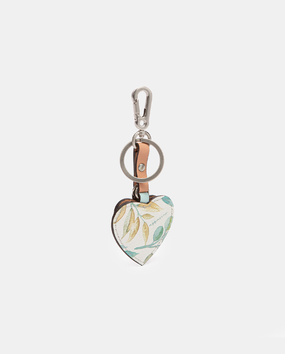 Leather keychain with two overlapping hearts in different colors. Silver-toned clasp and ring.