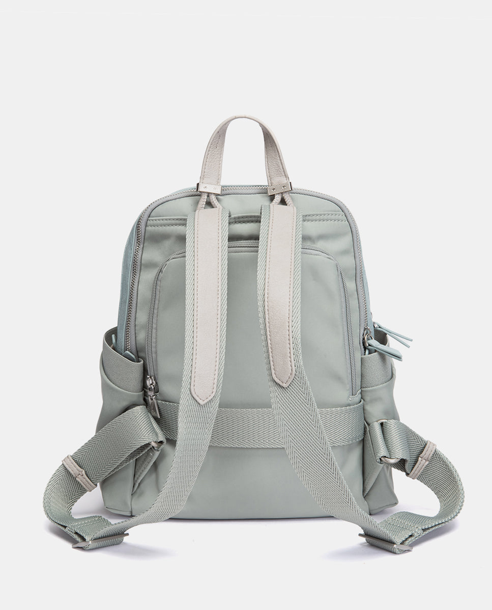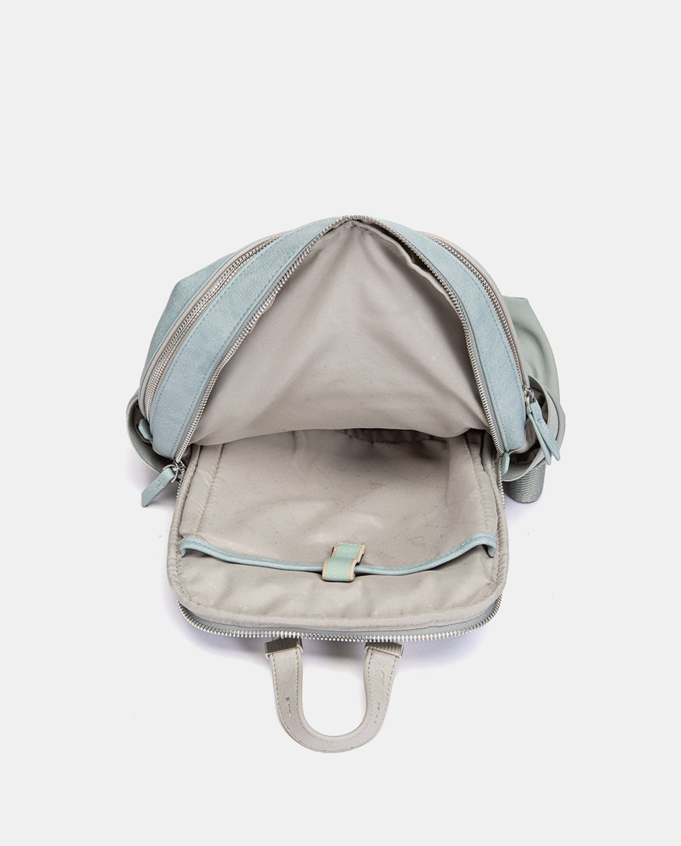 Backpack made from recycled fabrics, combining two different textures and offering great functionality. Its main features are: