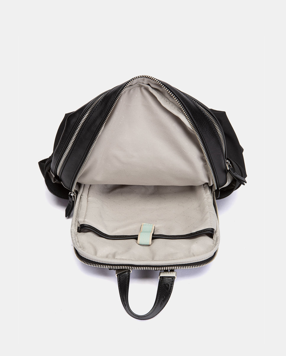 Backpack made from recycled fabrics, combining two different textures and offering great functionality. Its main features are: