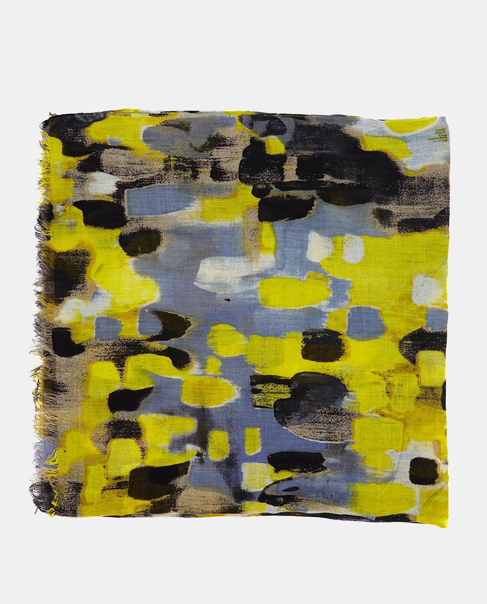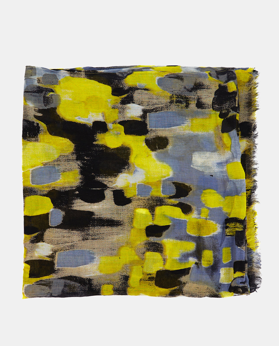Pañuelo de mujer de viscosa con un estampado abstracto. Su mezcla de tonalidades genera un atractivo y vibrante juego de colores, perfecto para complementar cualquier conjunto de verano. Los bordes deshilachados le dan un toque casual y relajado.
