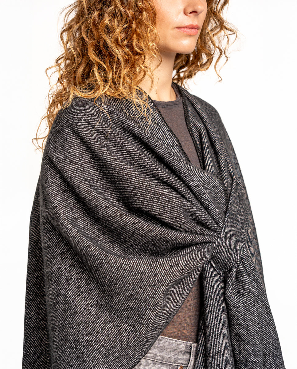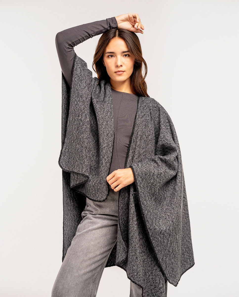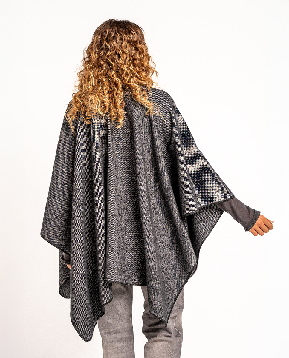 Black women's poncho. Its fabric is ultra-soft and very warm, perfect for fall and winter days. It can be adjusted to fit the body with a front tab. Very versatile, it will become a must-have for cold days.