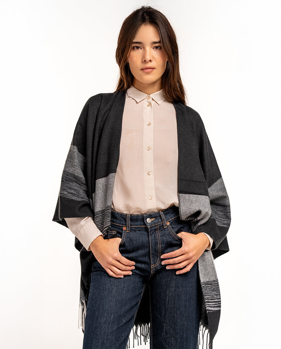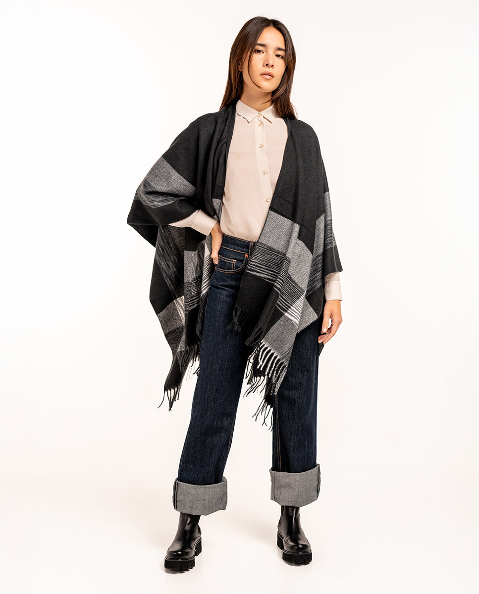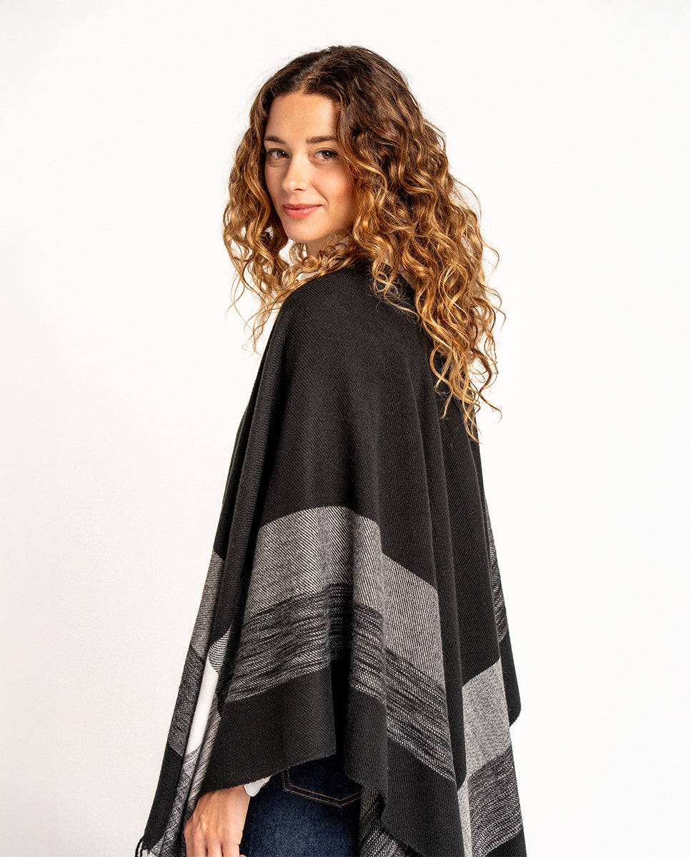Women's poncho with a striped print that combines different shades. Its fabric is ultra-soft and very warm, perfect for fall and winter days. Its fringed ends give it a very casual look. Very versatile, it will become a must-have for cold days.