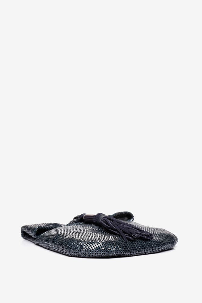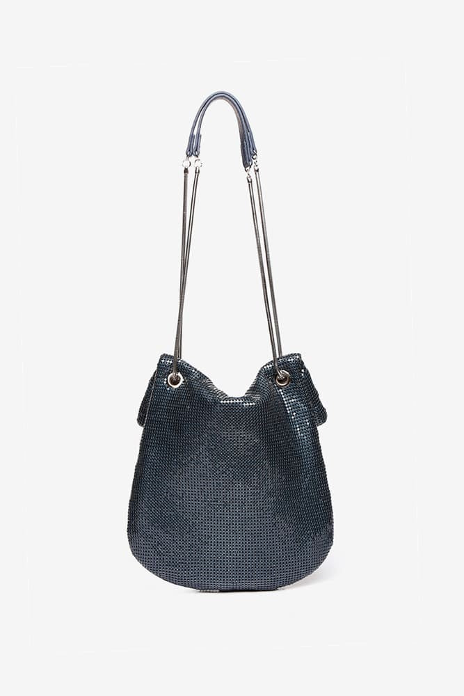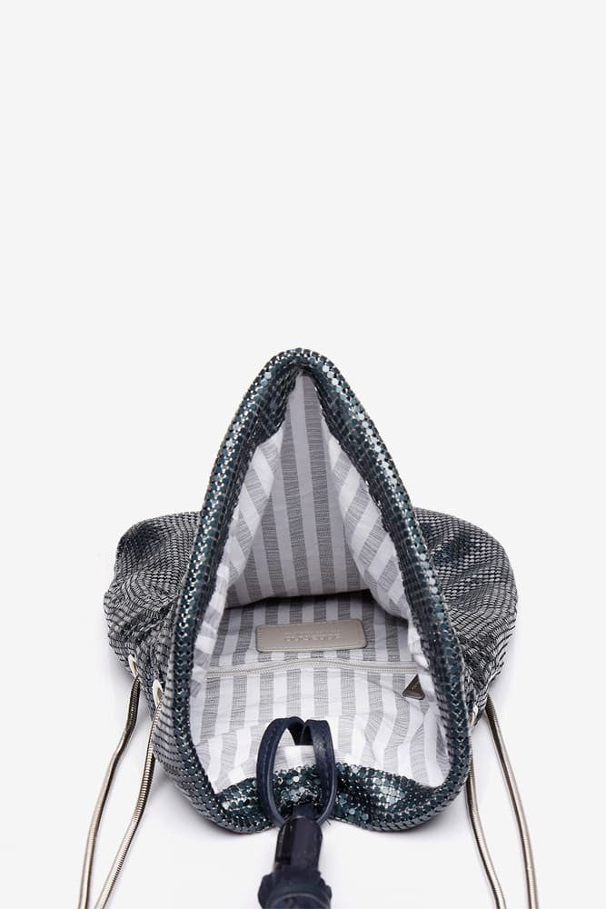 A multi-purpose party bag; thanks to the metallic runner strap, you can wear this as a shoulder bag or across the body. Made from metallic meshing, it will surely become a staple of your wardrobe. Featuring a flat and split leather tassel with a decorative acrylic piece, as well as an interior pocket with zip.