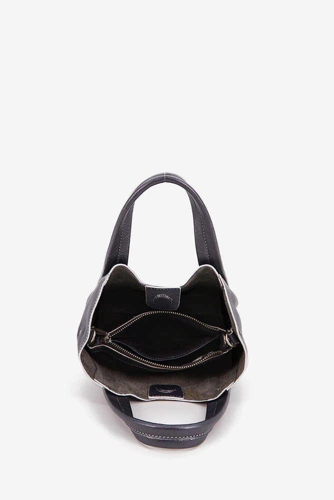 • Its exterior is characterised by visible stitching, magnetic top closure and a small metal appliqué with the brand's logo.