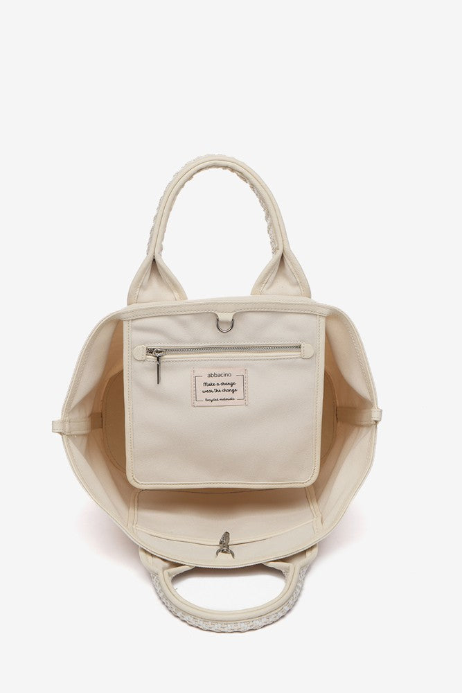 Small women's shopper bag crafted with recycled materials. A basket-style model, spacious and practical, featuring fabric handles with an original geometric embroidery. Dyed in timeless colors, it becomes a staple suitable for any season of the year. Its texture is fluid and very pleasant to the touch. Its main features include: