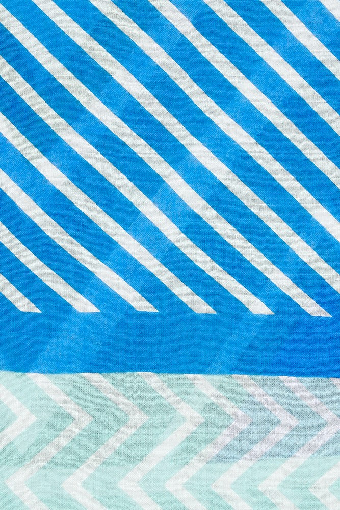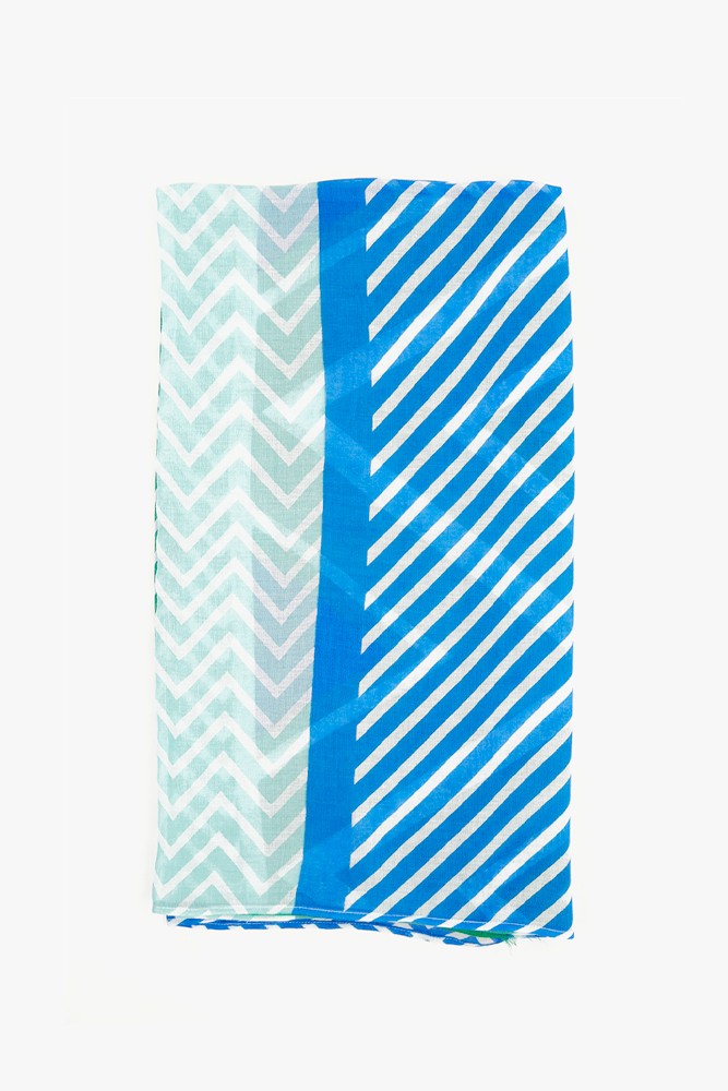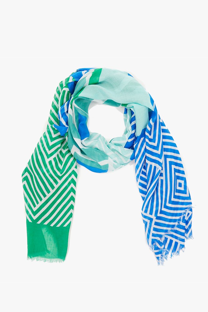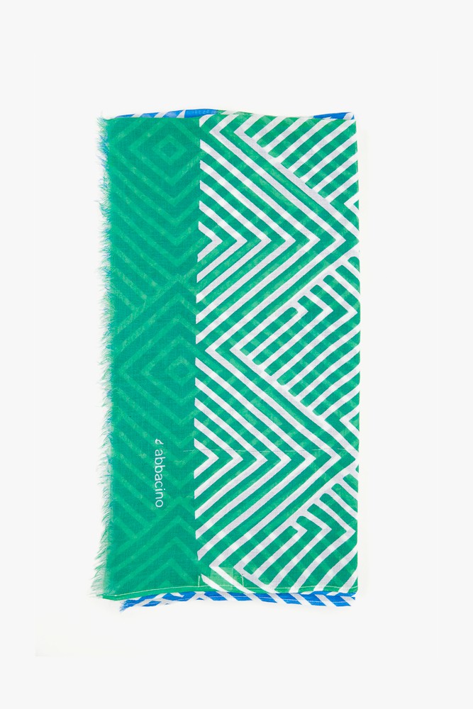 Women's viscose scarf with a beautiful geometric print. A design that stands out for its originality and the combination of bright and energetic colours, perfect for the summer months. Its frayed edges give it a modern and casual style. Its fabric is very light and fresh.