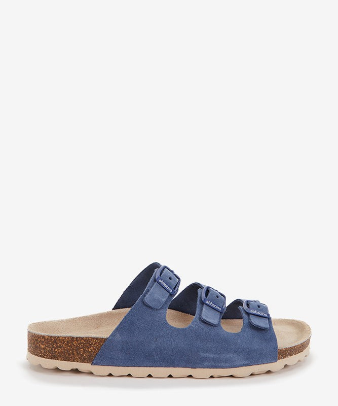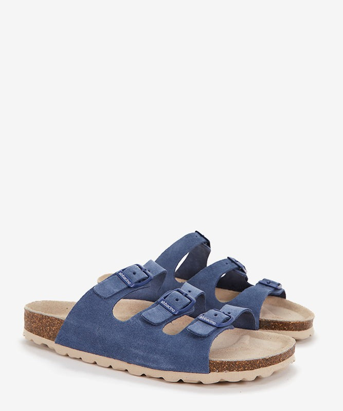 Sandalia plana de mujer de piel y triple hebilla en azul