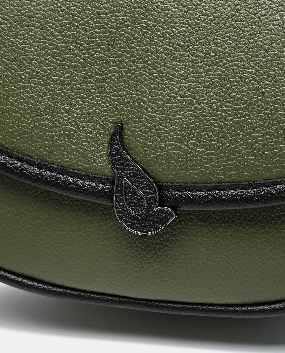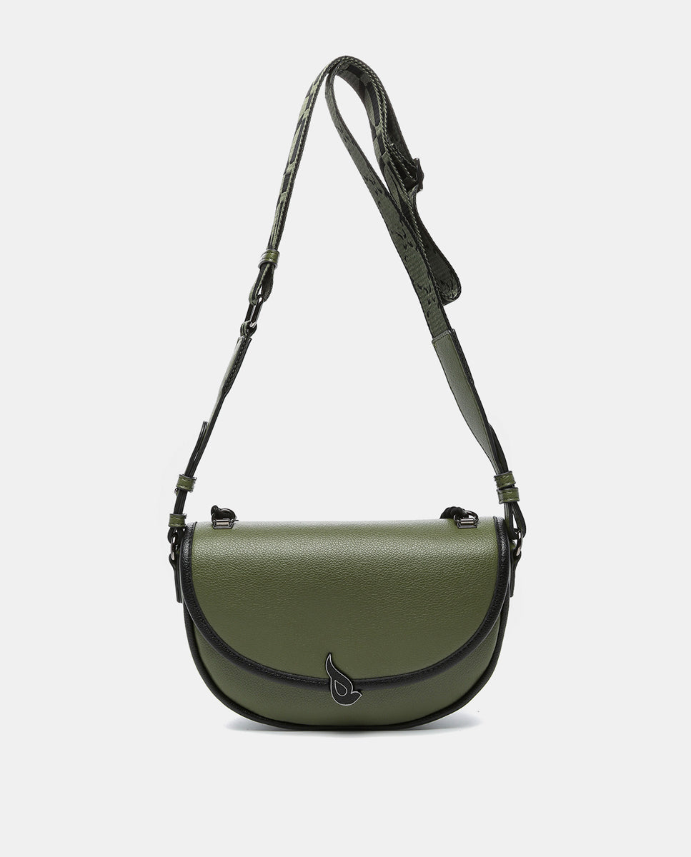 • Cierre frontal con solapa y un aplique metálico con el lotipo de la marca.