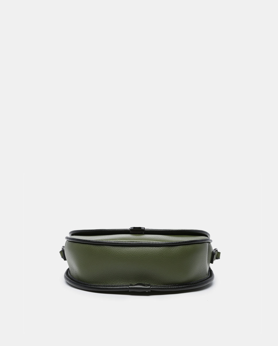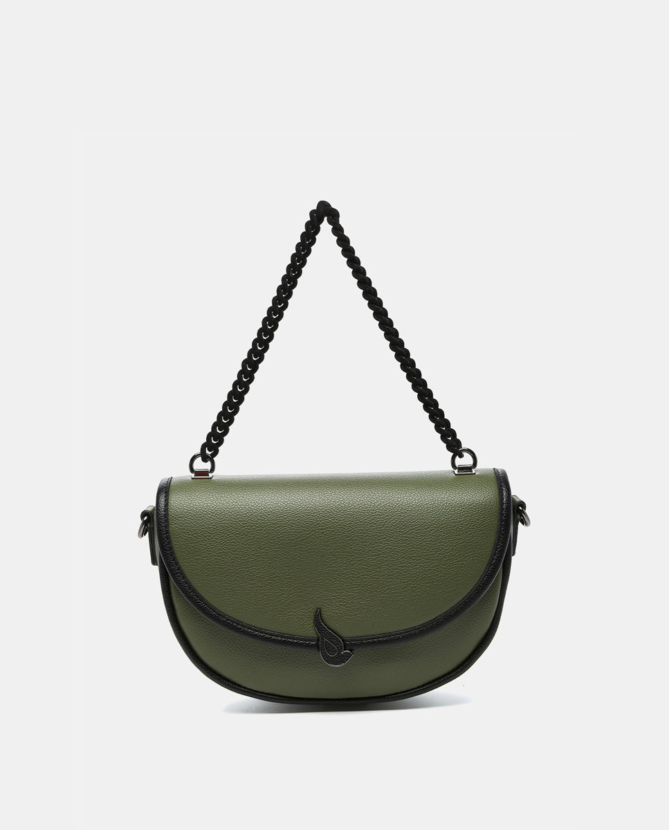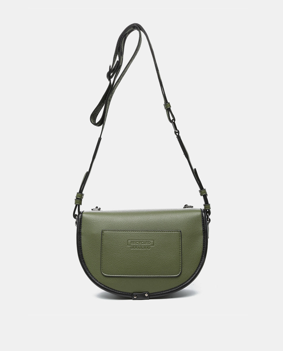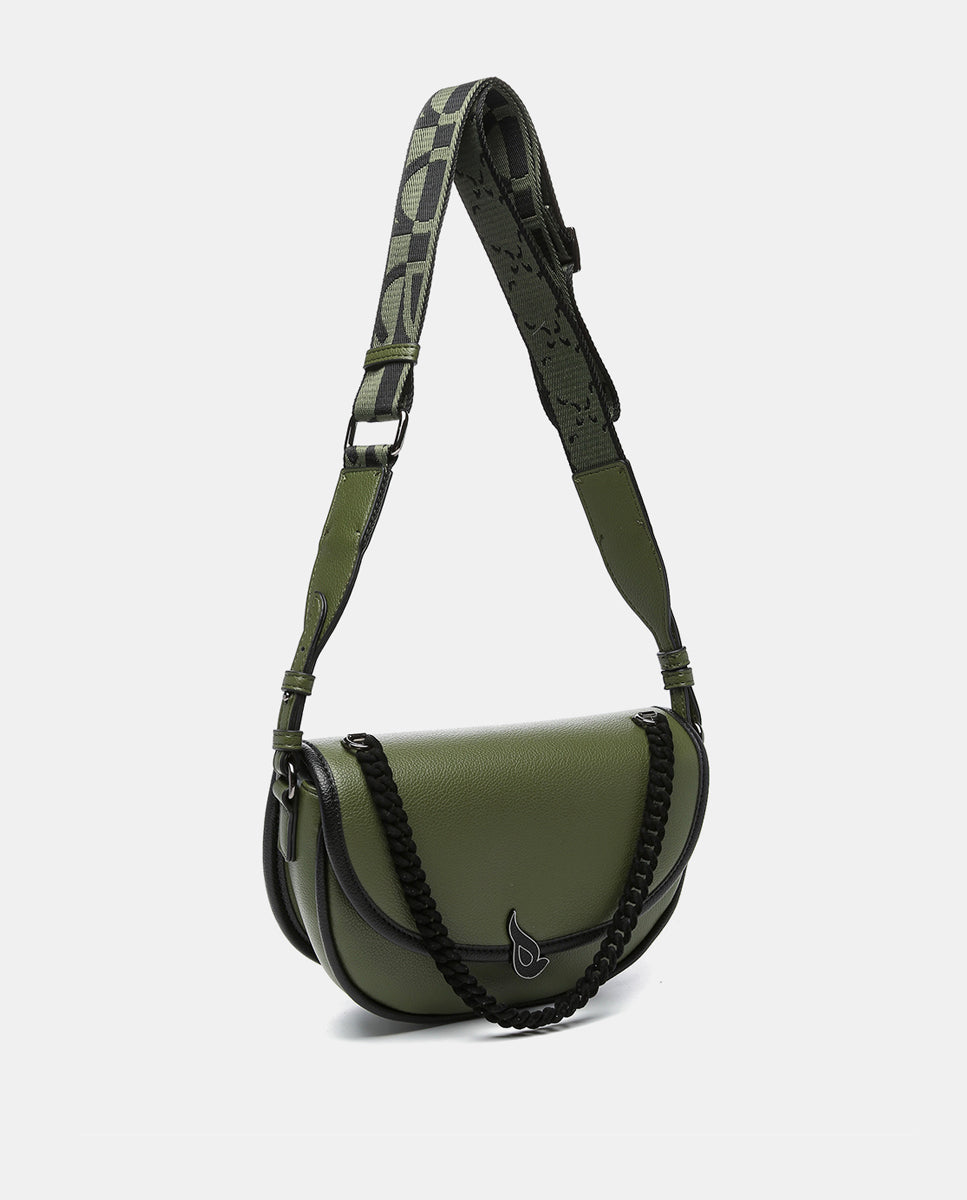 Bandolera de mujer en formato medialuna elaborada en materiales reciclados. Una apuesta arriesgada en esta nueva temporada de estilo juvenil y que persigue las últimas tendencias del momento. Cuenta con varios detalles destacables como su cierre con solapa con el logo de la firma, sus costuras forradas con un notorio ribete negro y un toque muy chic: una llamativa cadena que cuelga sobre su frontal.