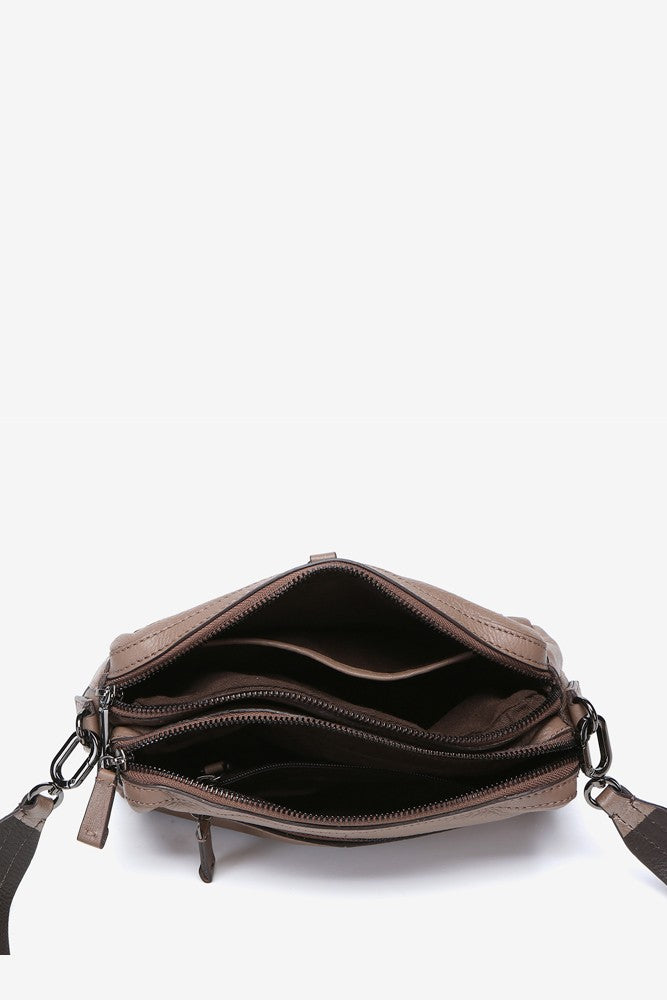 Bandolera de mujer elaborada en piel Premium. Un diseño que te acompañará en los días de frío y que destaca por la combinación de piel y ante. Su piel se tiñe en colores de temporada fácilmente combinables. Sus principales características son: