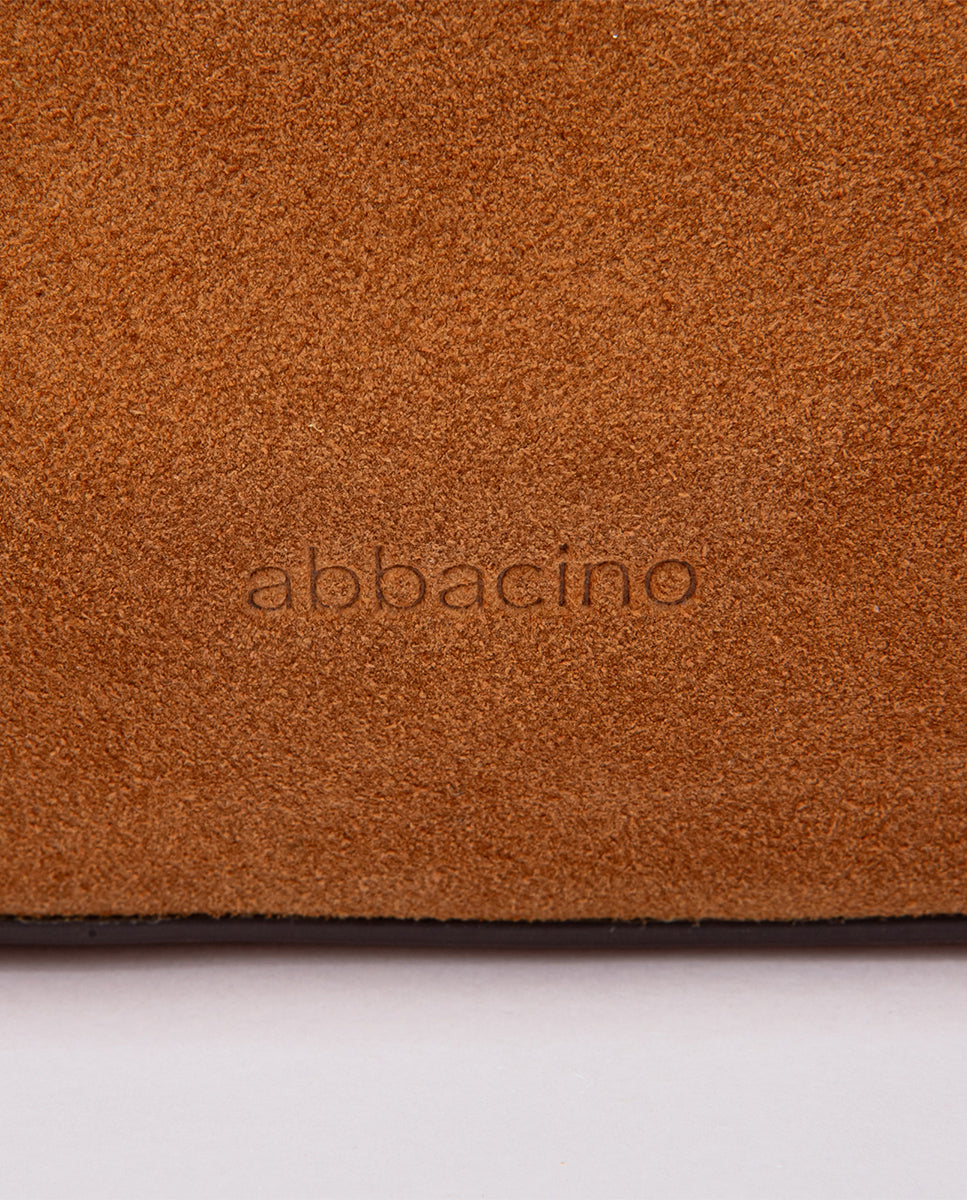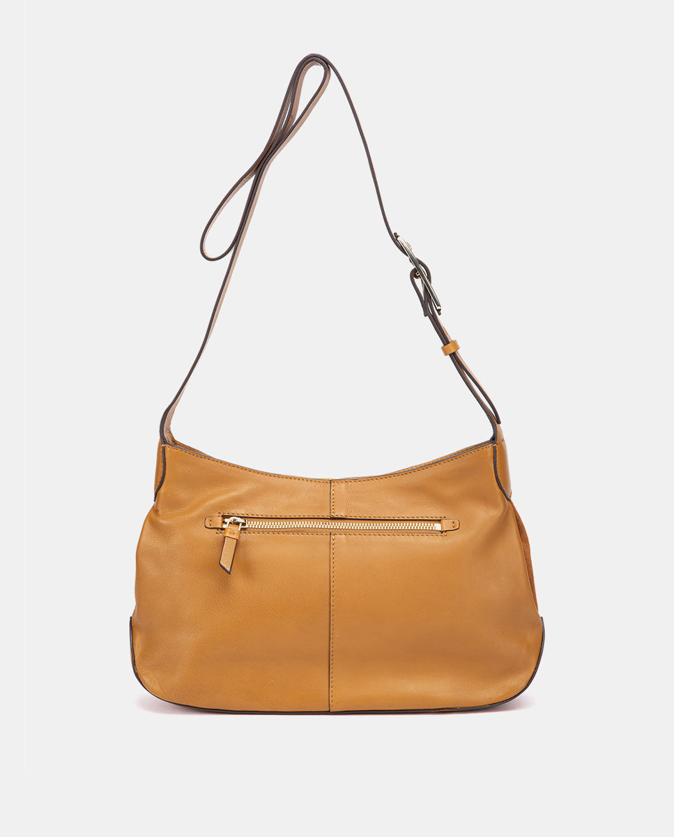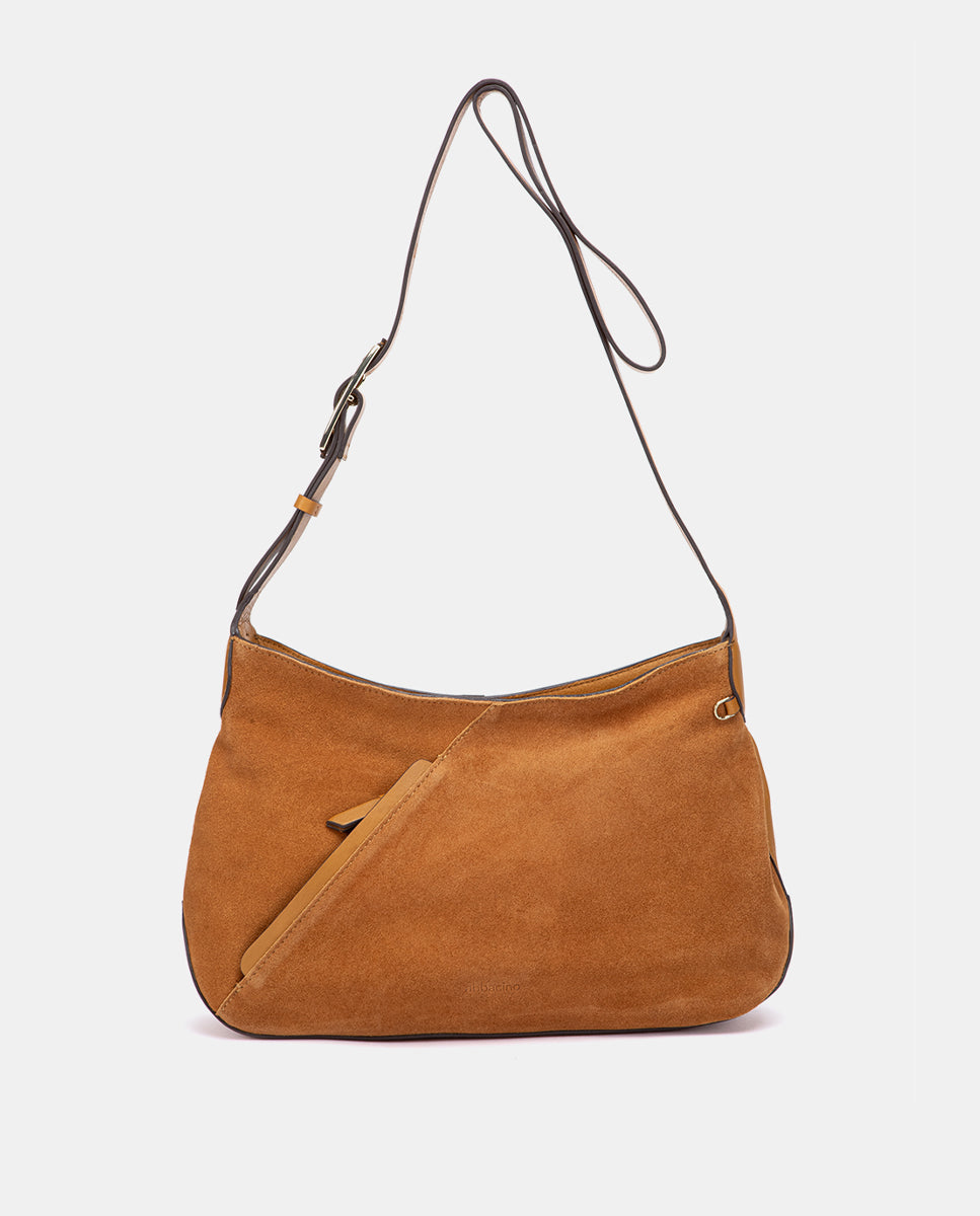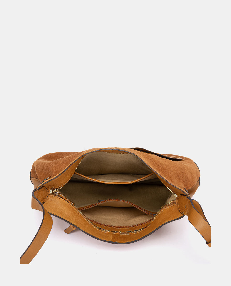 Bandolera en piel y serraje cognac