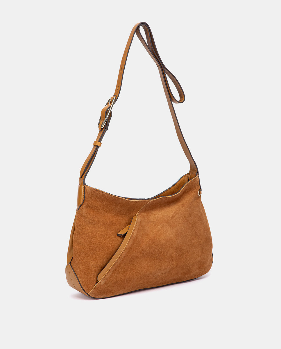 Bandolera confeccionada en piel lisa y serraje con líneas suaves y una silueta amplia y desenfadada. Sus principales características son: