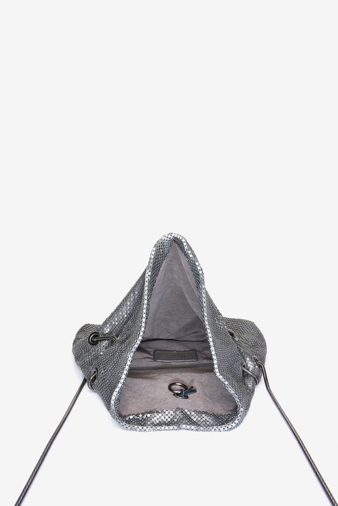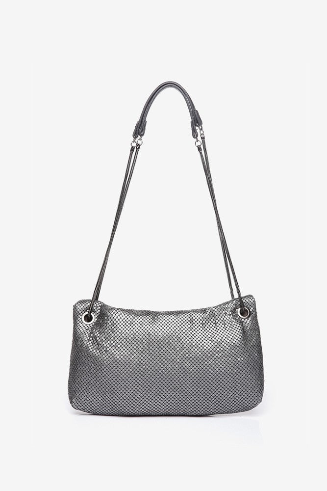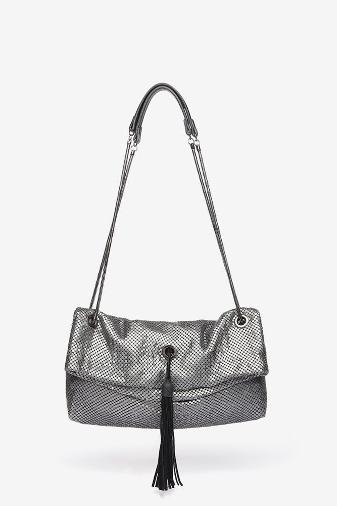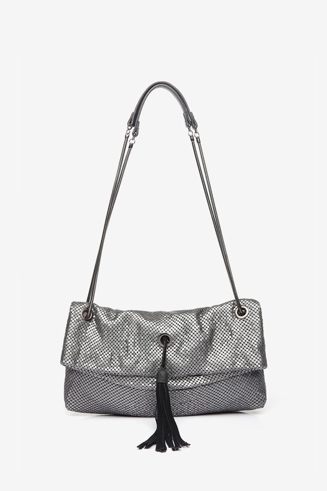 Bolso de fiesta realizado en malla metálica maxi, el material de tendencia. Asa metálica polivalente que te permite llevarlo tanto con doble asa al hombro como un asa bandolera. Color metalizado que te ofrece muchas posibilidades para combinarlo con tu armario. Solapa, base rectangular cómoda y manejable de aire atemporal. Bolsillo en el interior. Decorado con una borla de serraje y el logotipo grabado en las asas.