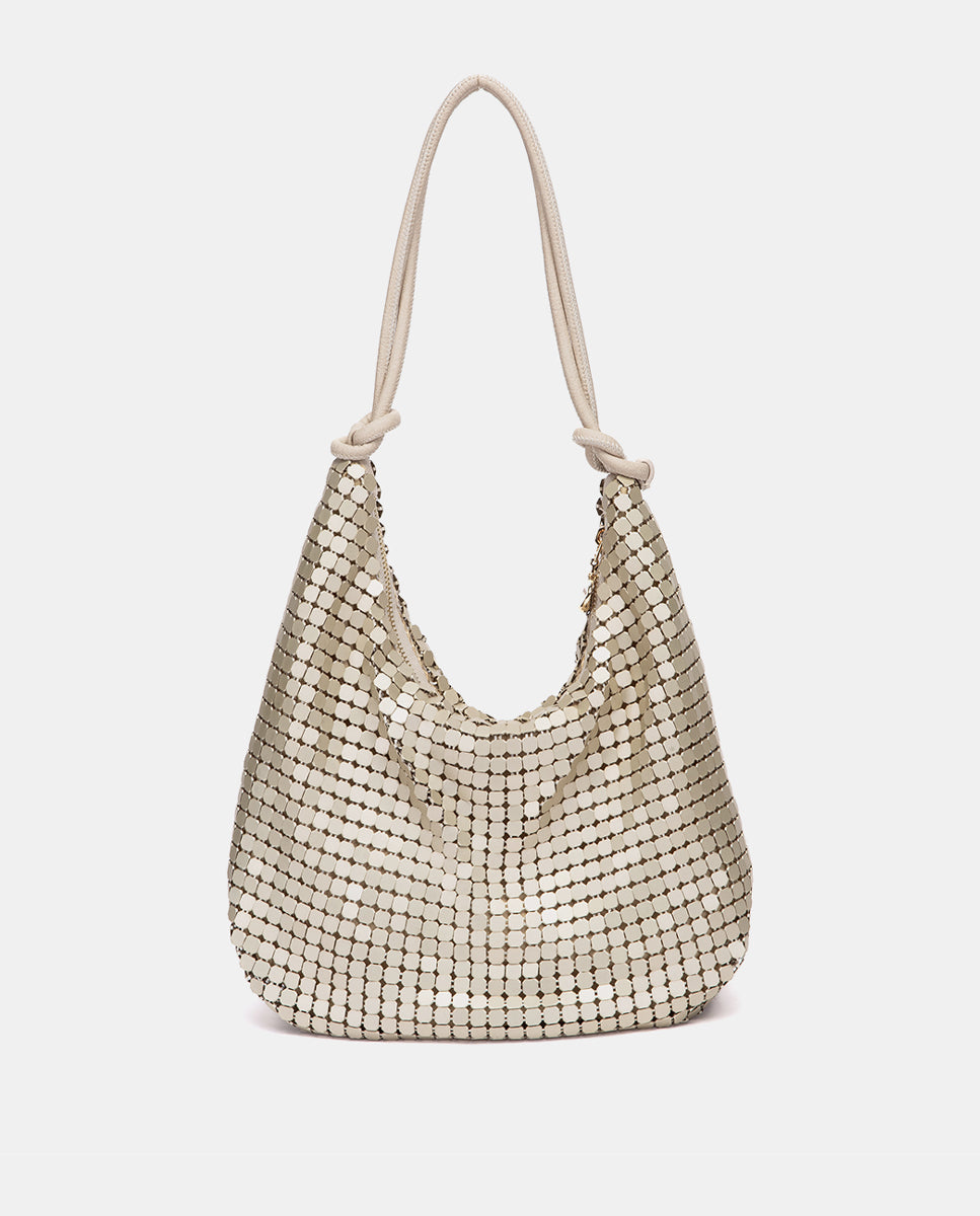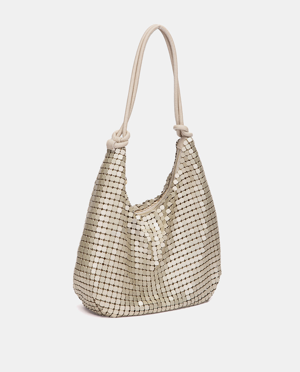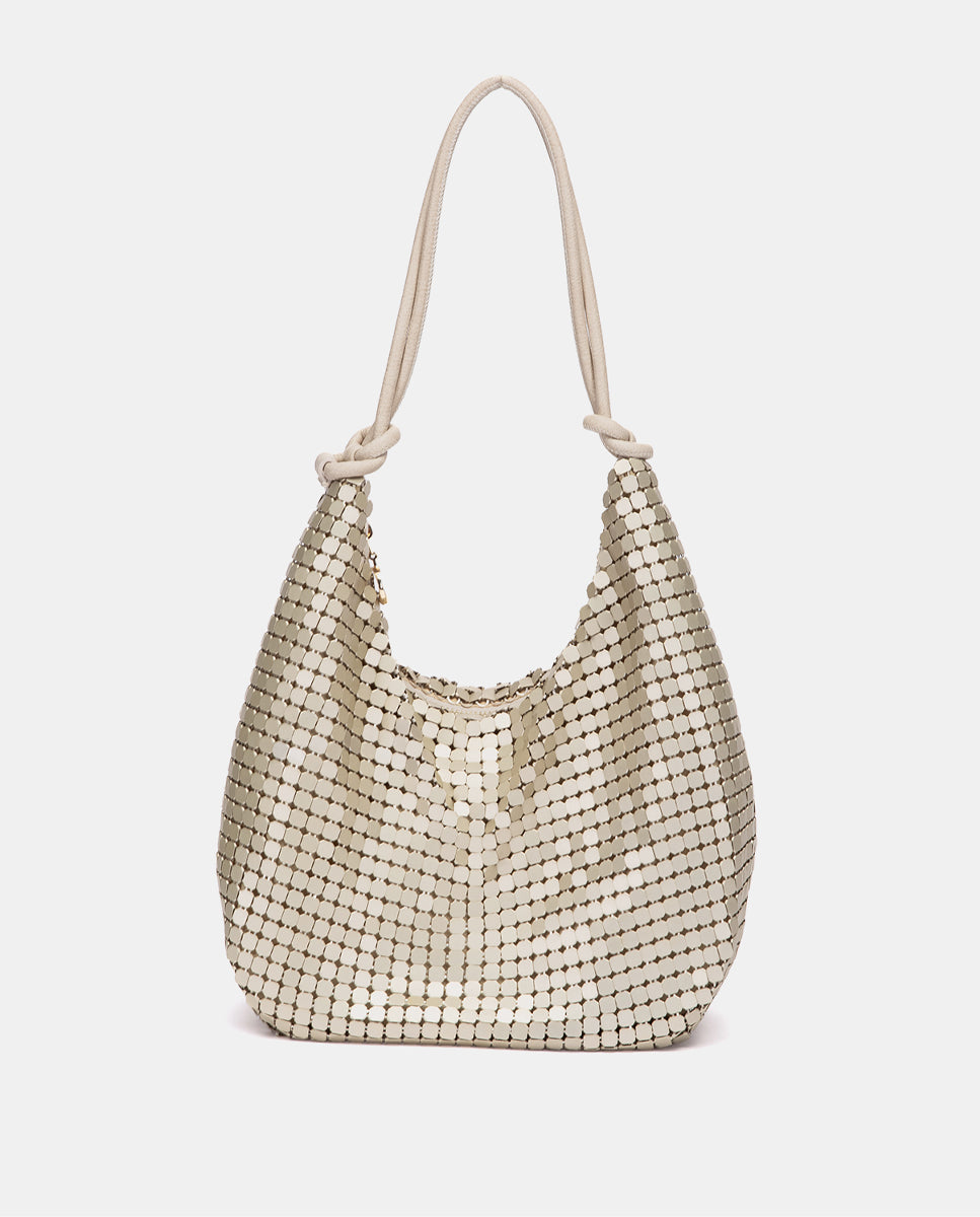 Bolso de hombro de fiesta, confeccionado en malla metálica con acabado brillante. Sus principales características son: