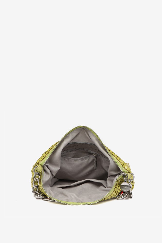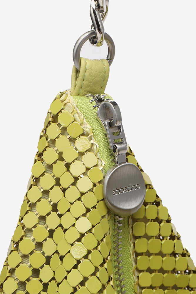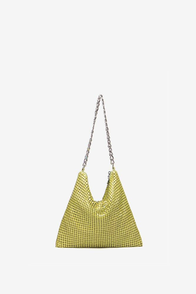 Bolso de hombro de fiesta de forma piramidal de mujer elaborado en malla metálica. Un diseño que se viste en los colores de temporada con el que brillarás allá donde vayas, perfecto para la noche y el día, es la opción ideal para crear looks únicos.. Sus principales características son: