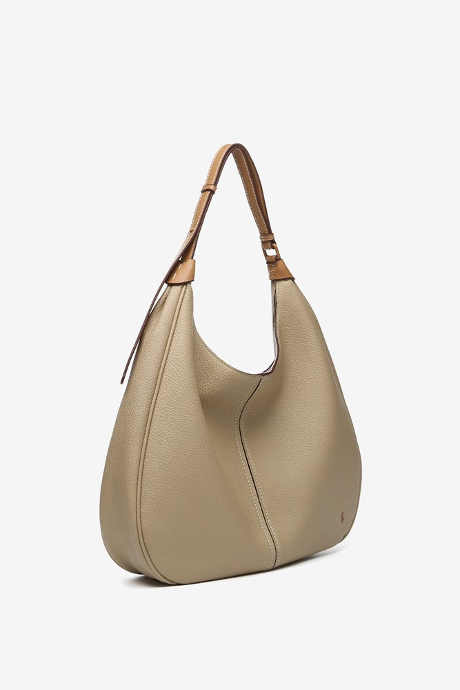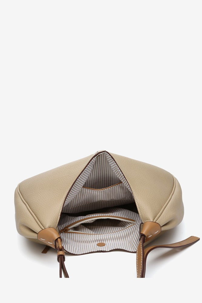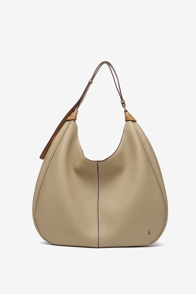 Maxi bolso de hombro estilo hobo elaborado en materiales reciclados. Sencillo y minimalista dispone de una amplia capacidad interior, perfecto para acompañarte a la oficina. Dispone de detalles en color cuero. Sus principales características son: