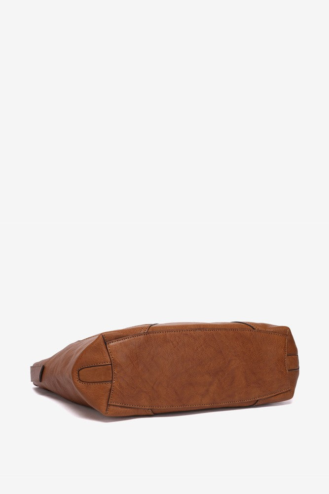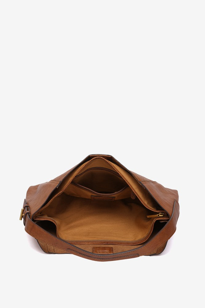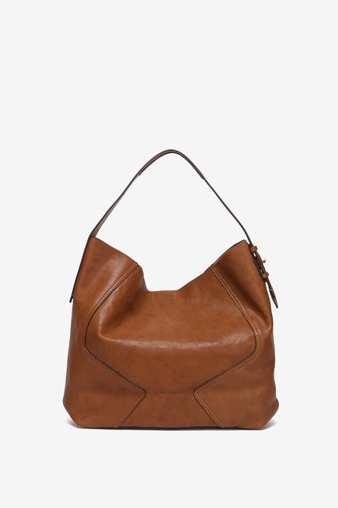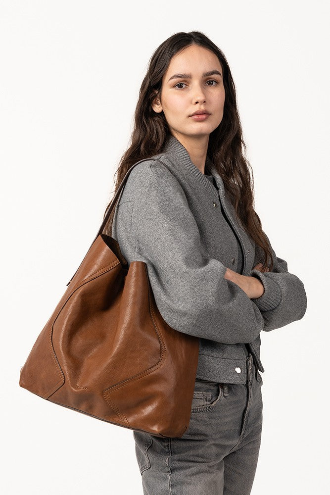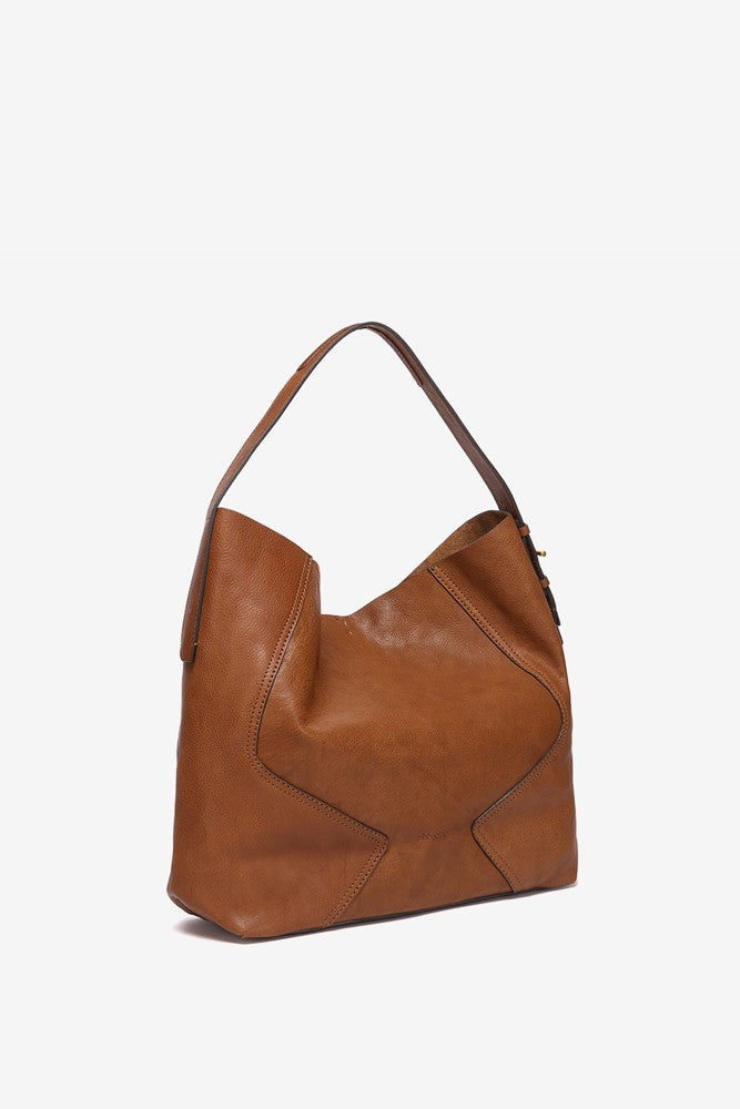Bolso de hombro estilo hobo elaborado con piel Premium, suave y fluida. Amplio, ligero y funcional, este modelo destaca por el efecto geométrico creado por la superposición de retales de piel. Sus principales características son: