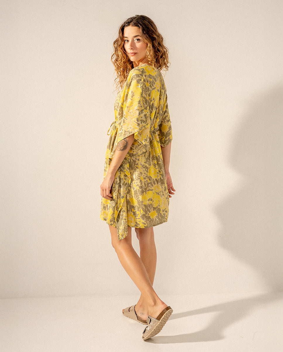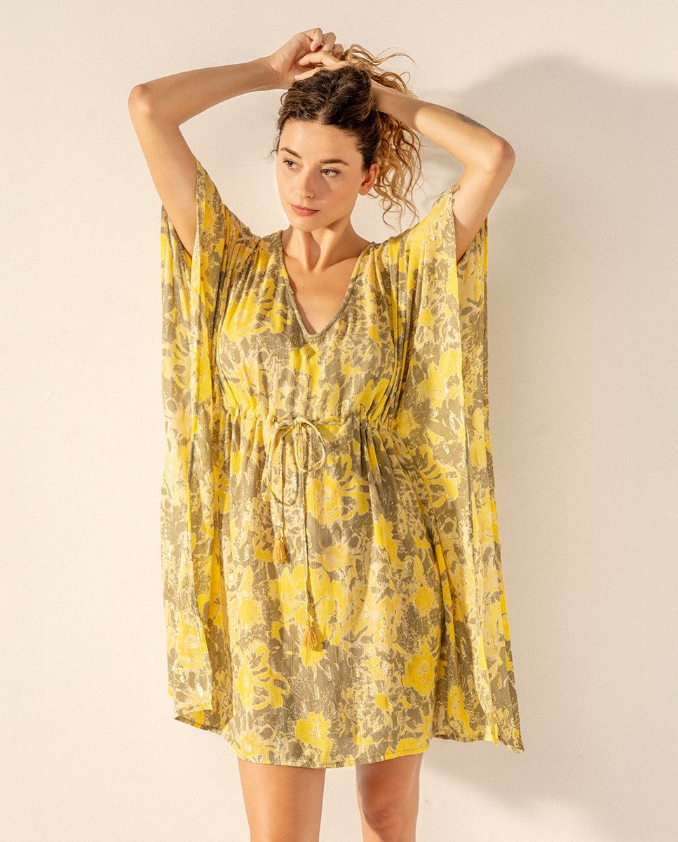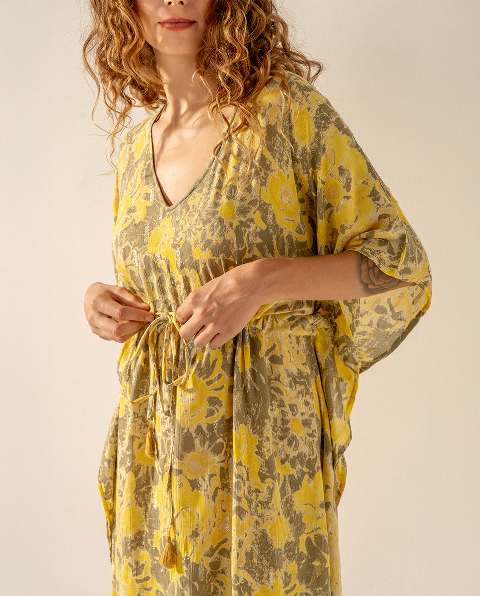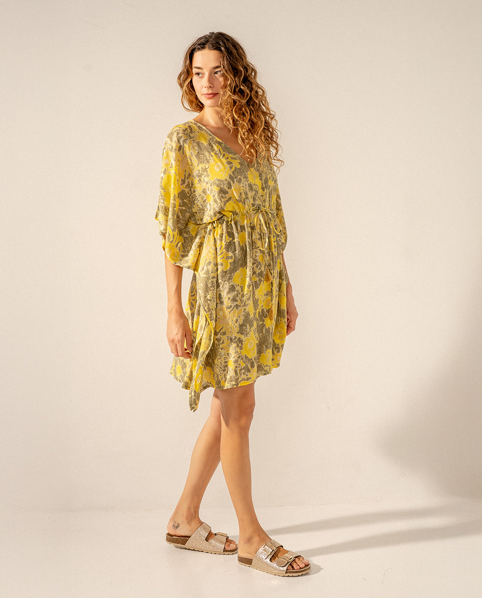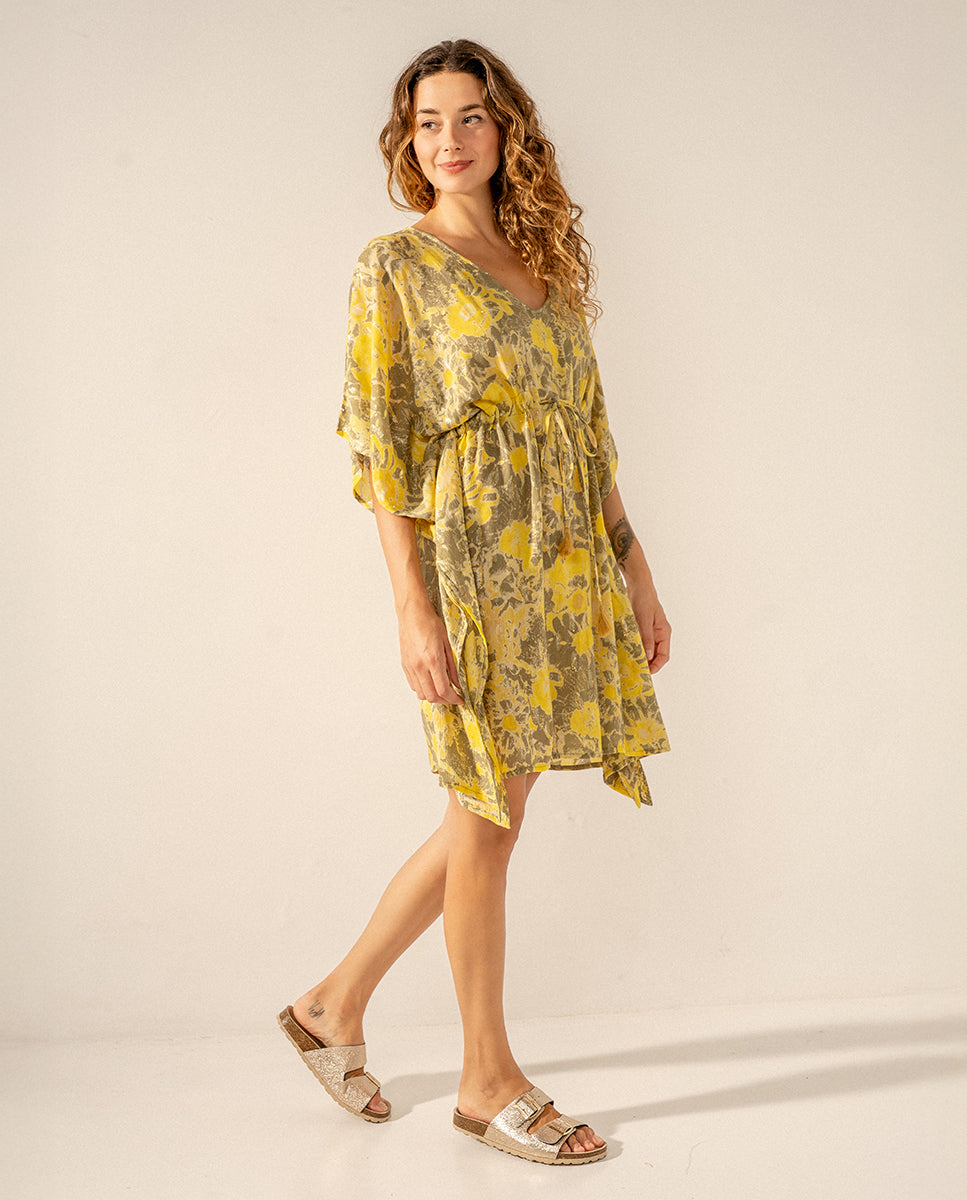 Caftán de mujer elaborado en algodón con estampado abstracto. Su tejido es muy holgado y suave al tacto, por lo que es un complemento perfecto para acompañarnos durante los días más calurosos del año. Cuenta con un favorecedor escote pico y un ajuste mediante un lazo en la cintura para estilizar la silueta.