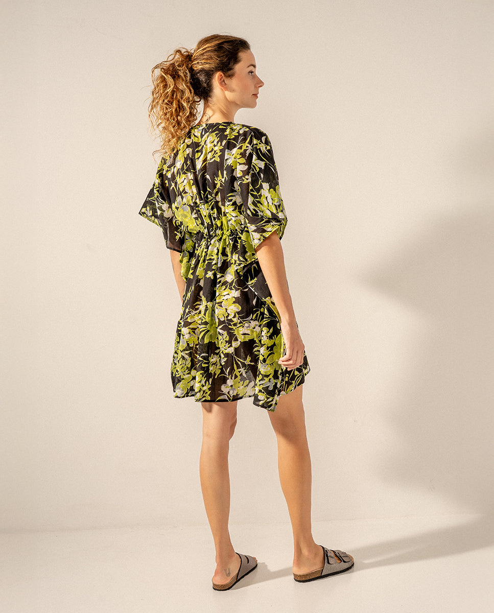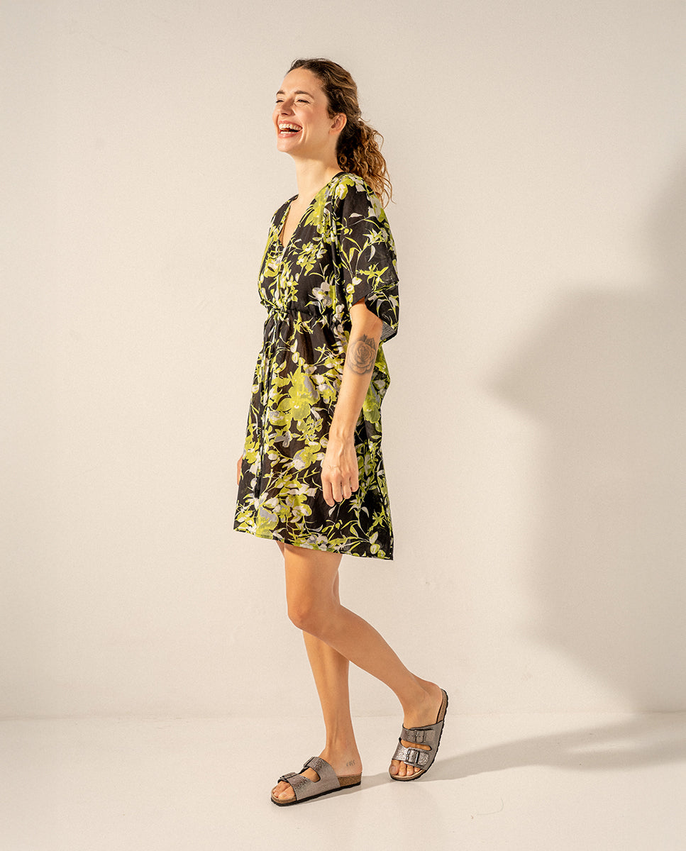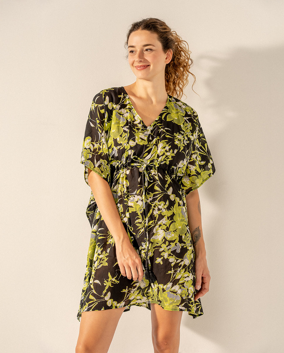 Caftán de mujer elaborado en algodón con estampado floral. Su tejido es muy holgado y suave al tacto, por lo que es un complemento perfecto para acompañarnos durante los días más calurosos del año. Cuenta con un favorecedor escote pico y un ajuste mediante un lazo en la cintura para estilizar la silueta.