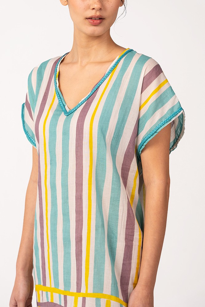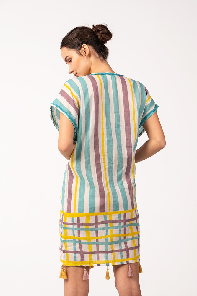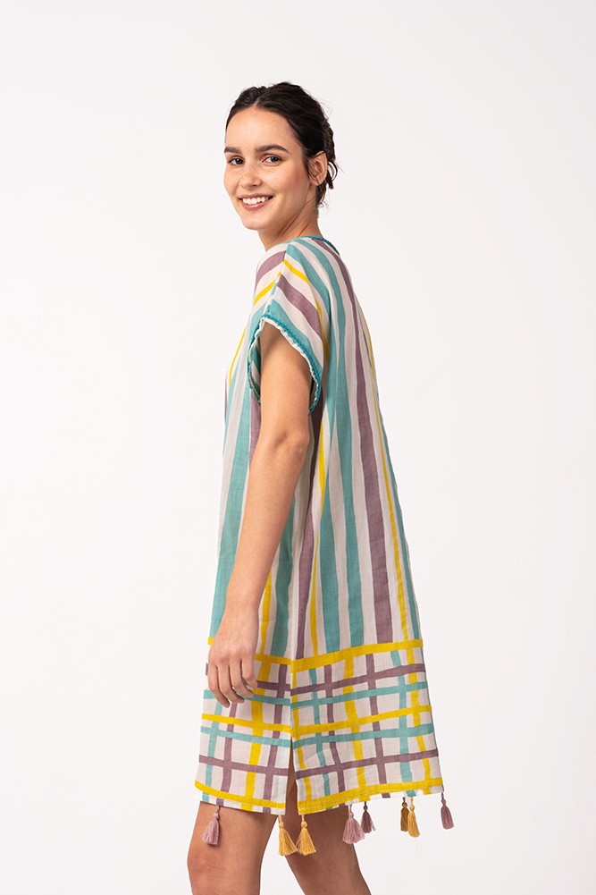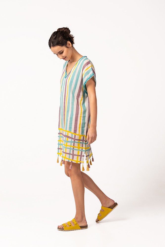 Caftán de mujer elaborado en algodón con un estampado a rayas. Sus colores vivos y su print nos transportan directamente a los cálidos días de verano. Su tejido es muy holgado y suave al tacto, por lo que es un complemento perfecto para acompañarnos durante los días más calurosos del año. Dispone de un escote pico muy favorecedor y borlas en los bajos.