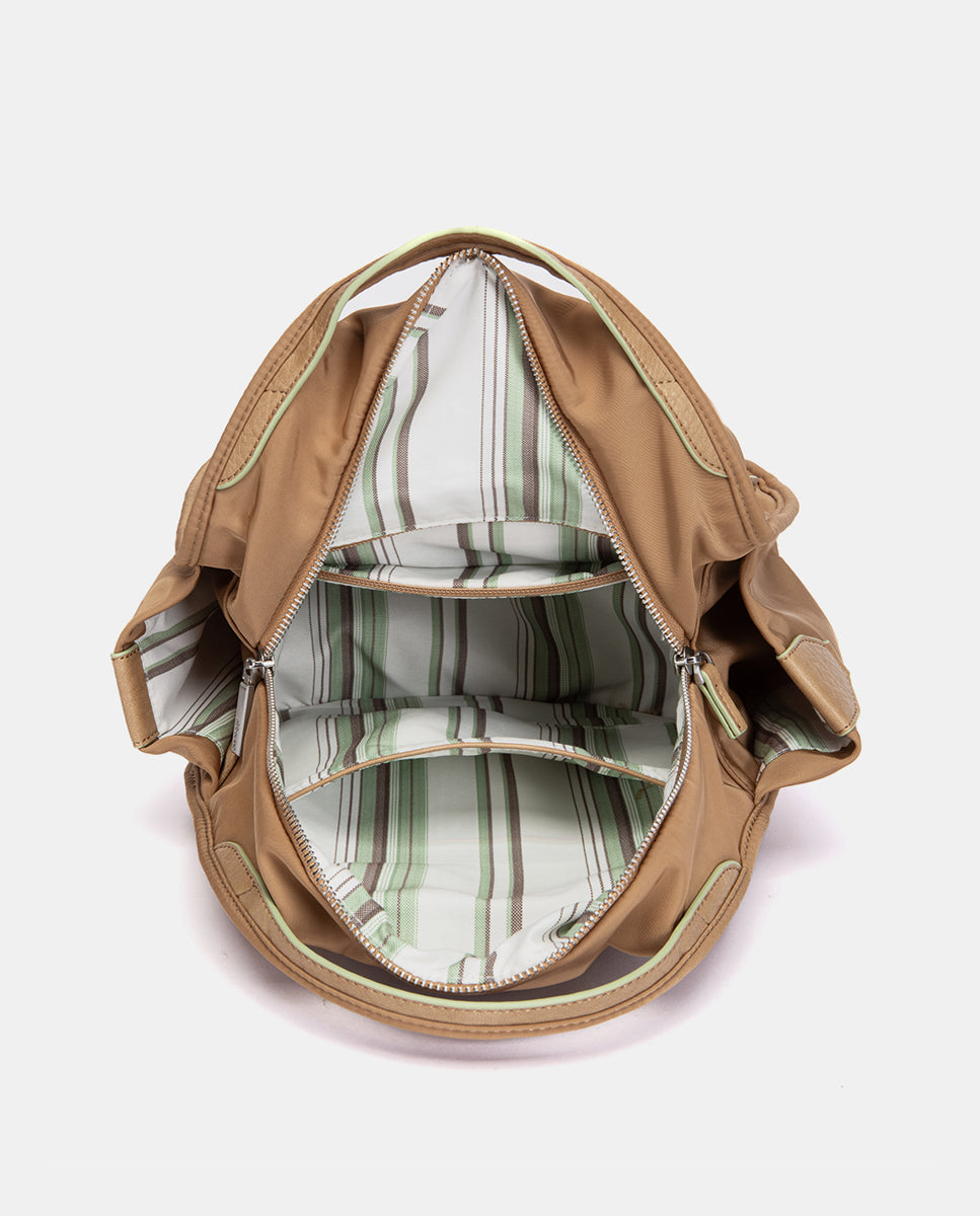 Mochila confeccionada en tejidos reciclados, ligera y fluida, con tacto suave y gran capacidad, ideal para el uso diario. Sus principales características son: