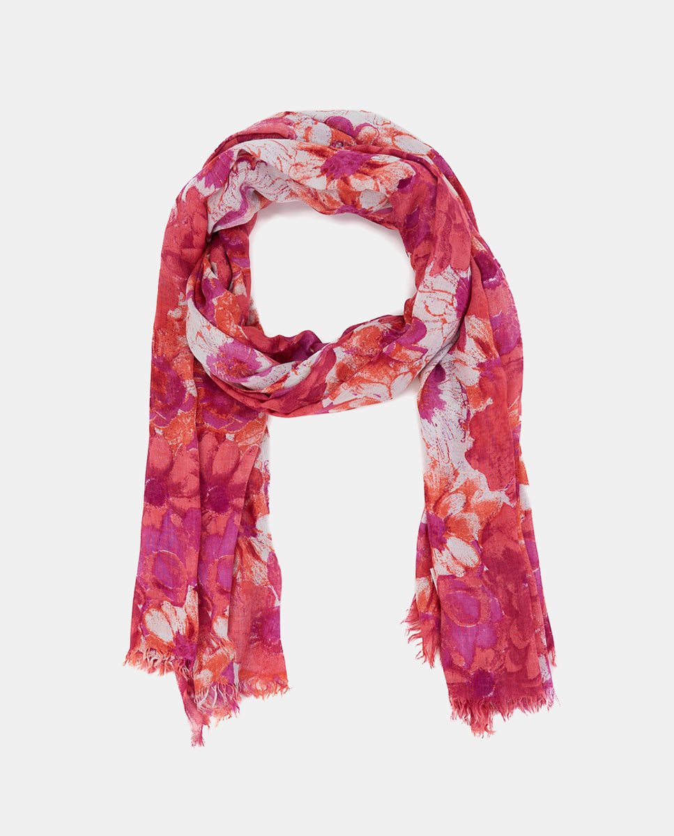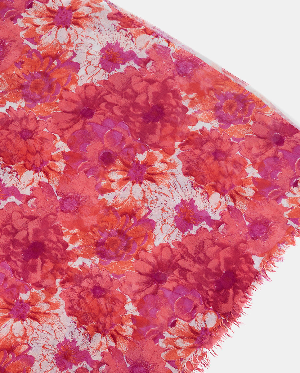 Pañuelo de mujer de viscosa con estampado floral. Combina diferentes colores, todos ellos en armonía, ideales para darle un toque especial a cualquier conjunto de verano. Sus bordes deshilachados añaden un detalle más desenfadado y cómodo.