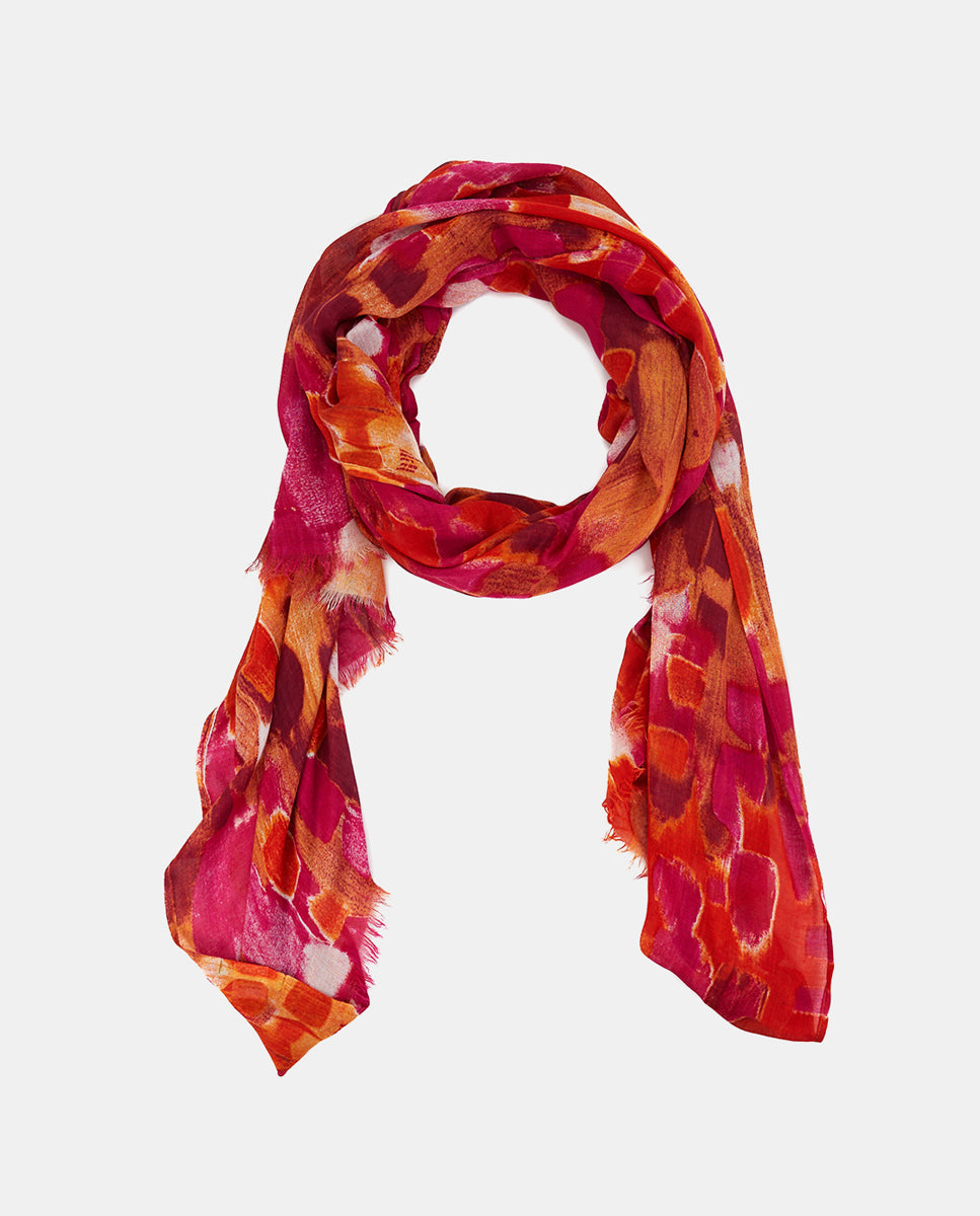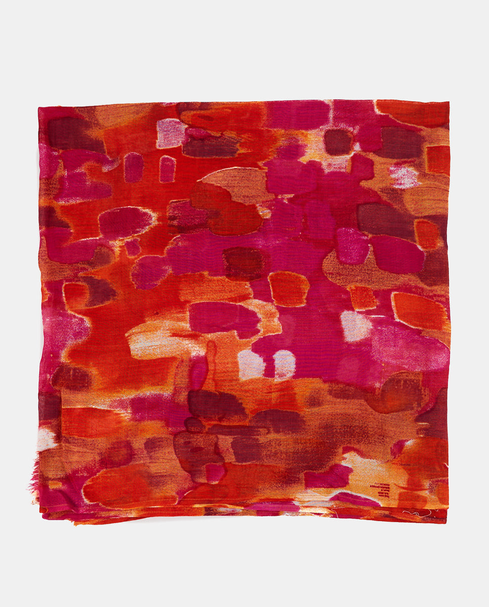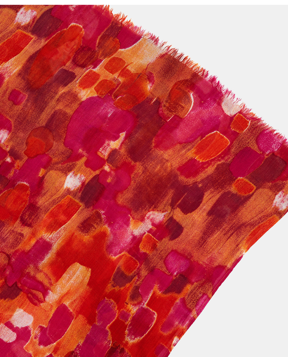Pañuelo de mujer de viscosa con un estampado abstracto. Su mezcla de tonalidades genera un atractivo y vibrante juego de colores, perfecto para complementar cualquier conjunto de verano. Los bordes deshilachados le dan un toque casual y relajado.