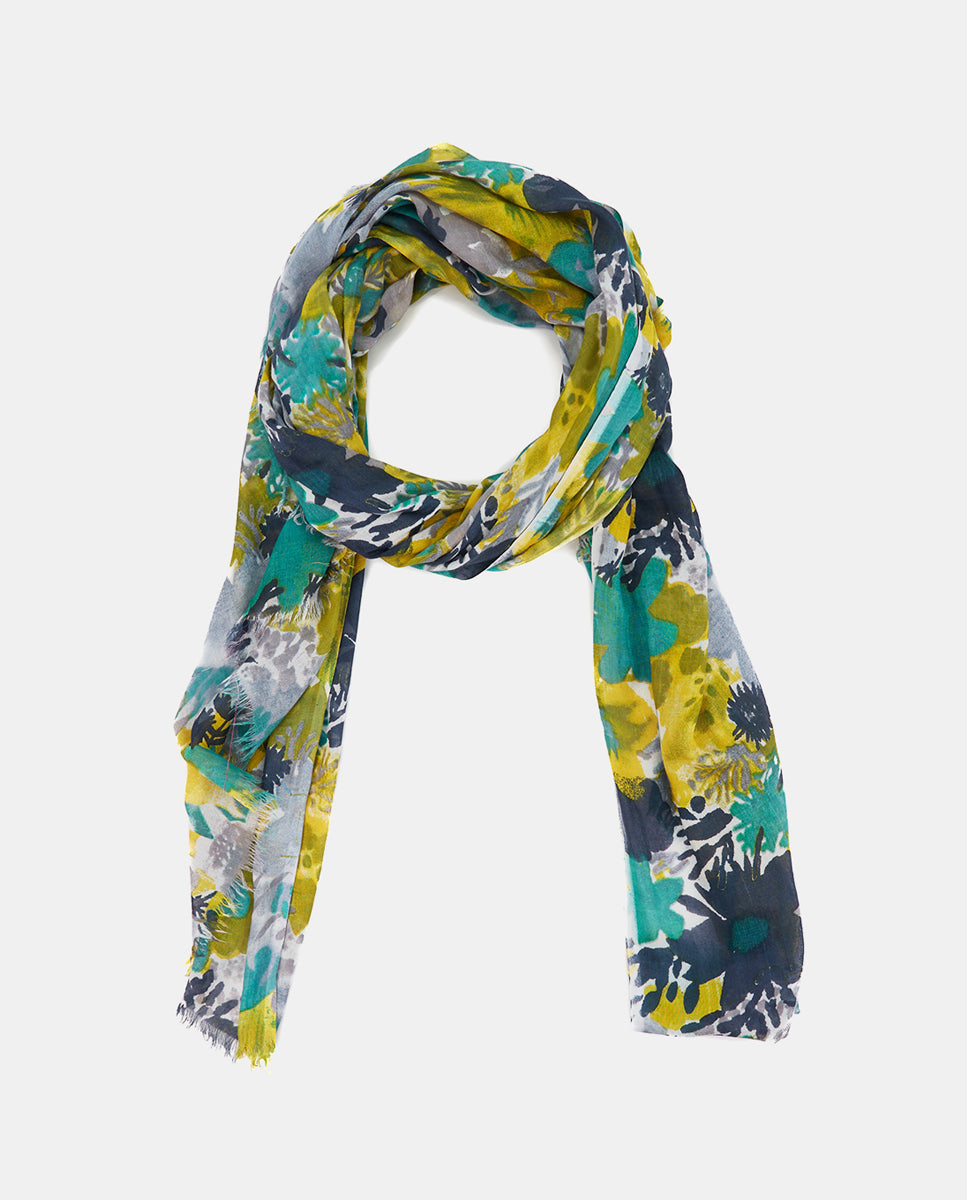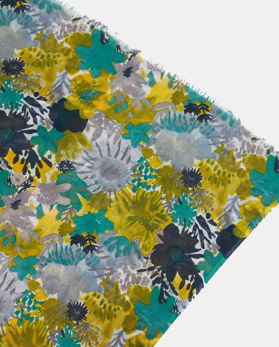 Pañuelo de mujer de viscosa, suave y ligero al tacto, con un delicado estampado floral. Un accesorio versátil y práctico, perfecto para todo tipo de ocasiones. Sus bordes deshilachados le dan un toque moderno y casual.