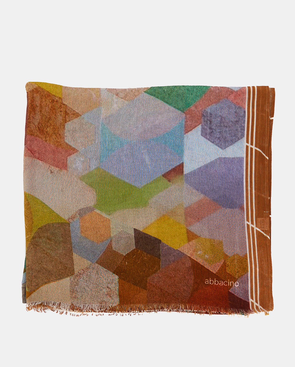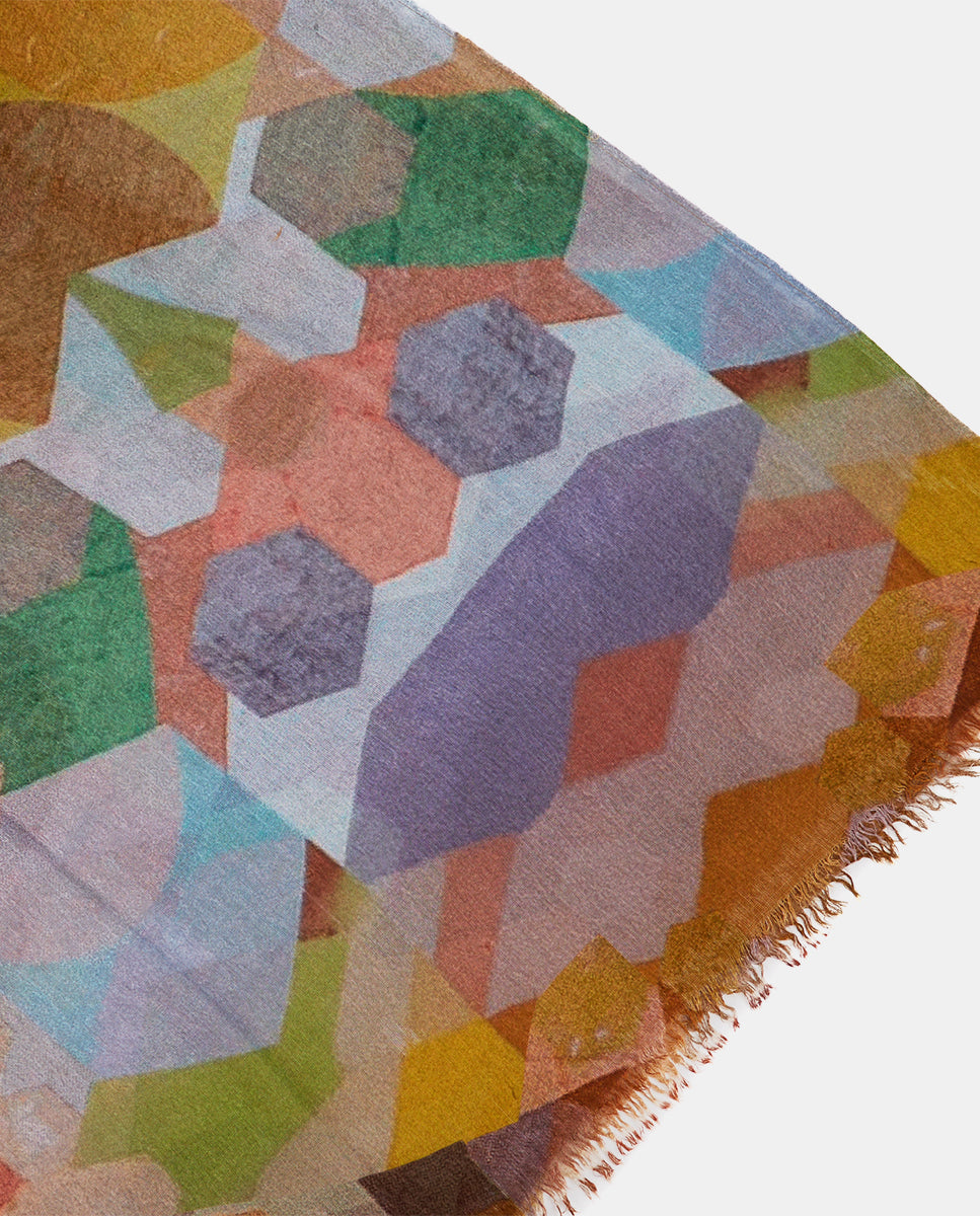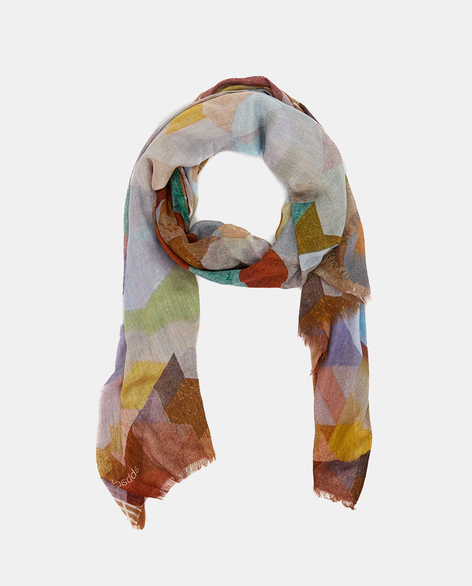 Pañuelo de mujer elaborado 100% en viscosa, con un estampado geométrico que evoca las formas de un caleidoscopio. Su tejido fresco y ligero lo convierte en el complemento ideal para los días de verano, mientras que los bordes deshilados le aportan un aire casual y desenfadado.