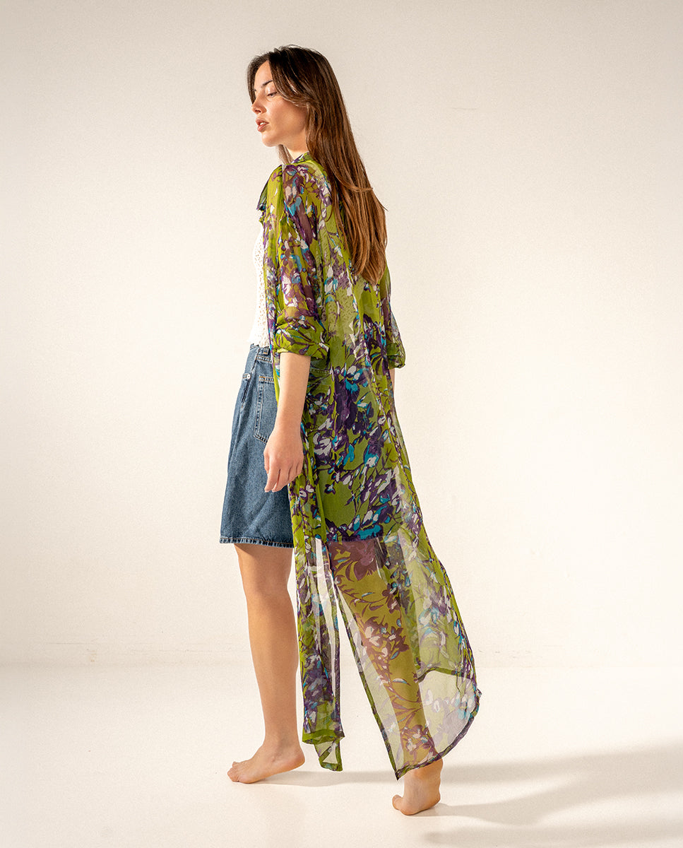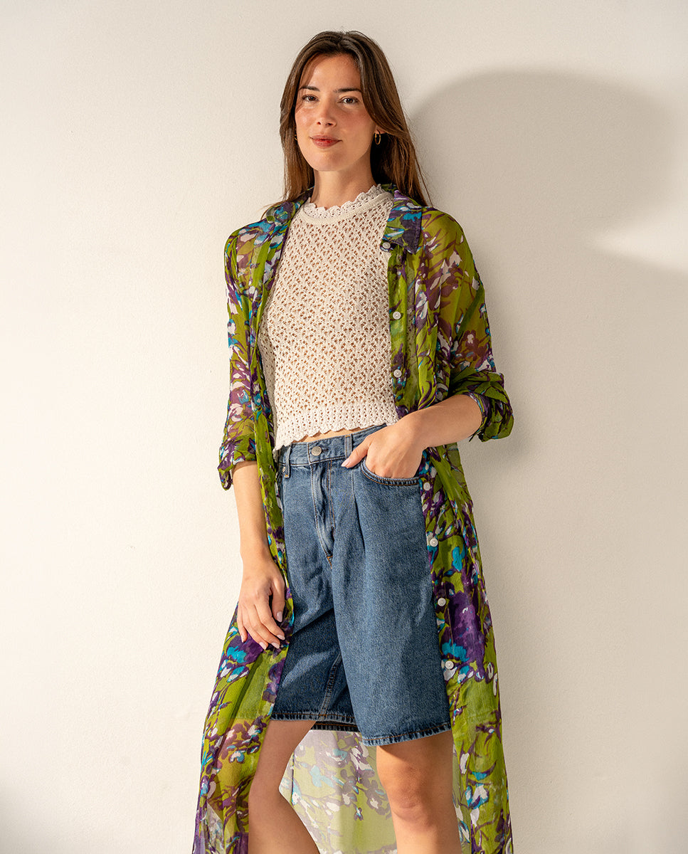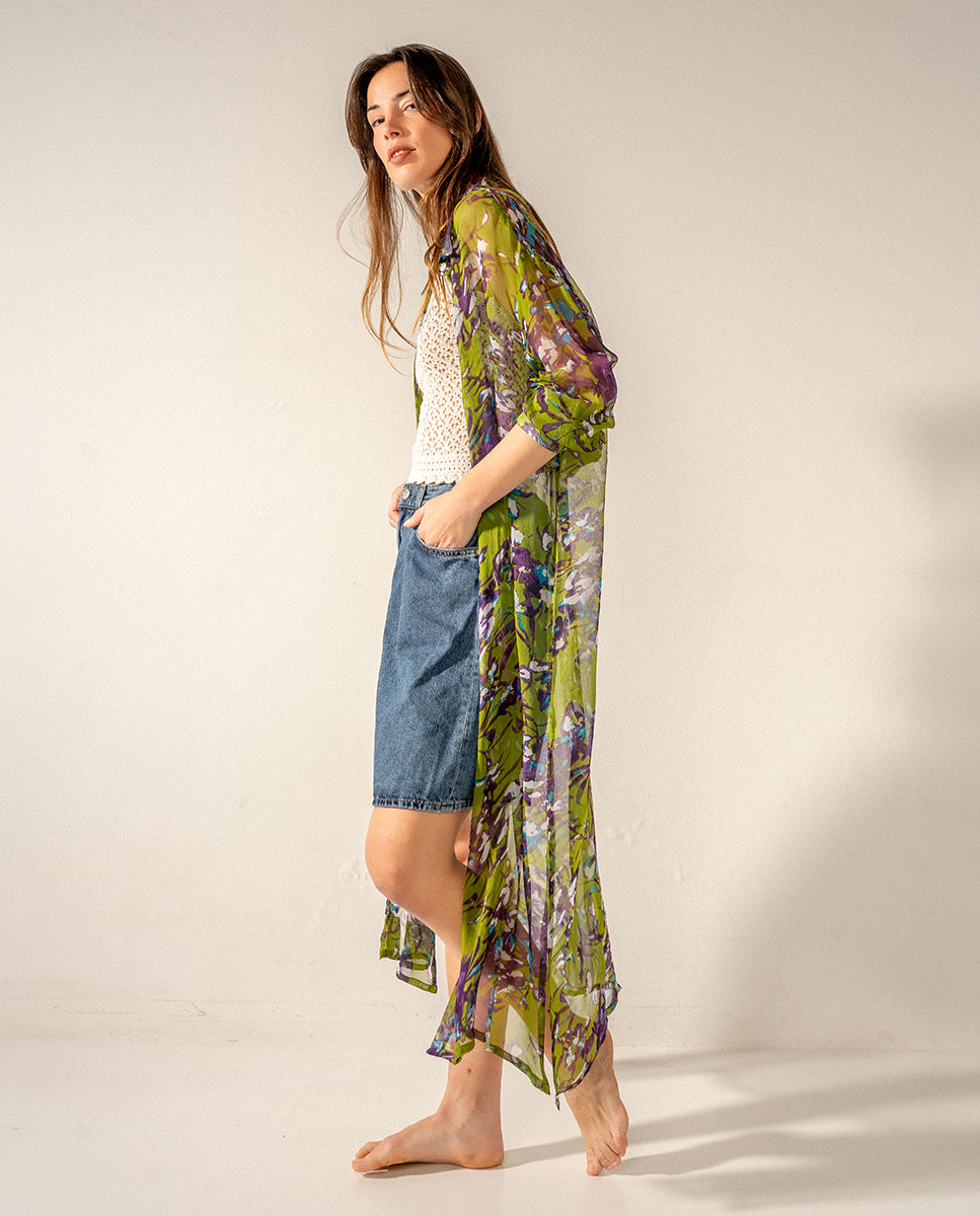 Túnica larga de mujer de viscosa semitransparente con estampado floral. Un diseño muy versátil que te permitirá usarlo para un día de playa o para un paseo a media tarde. Su tejido suave y holgado es muy transpirable, ideal para los días de calor. Cuenta con botones en su frontal.