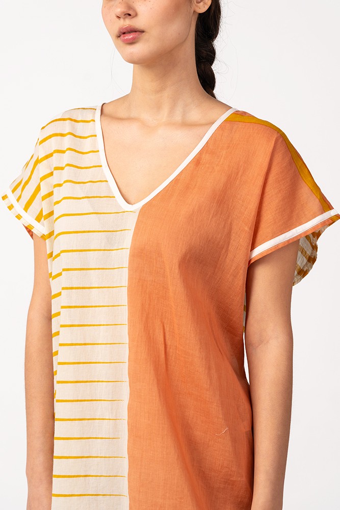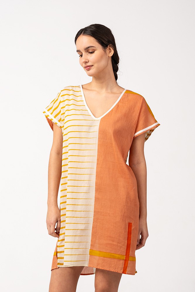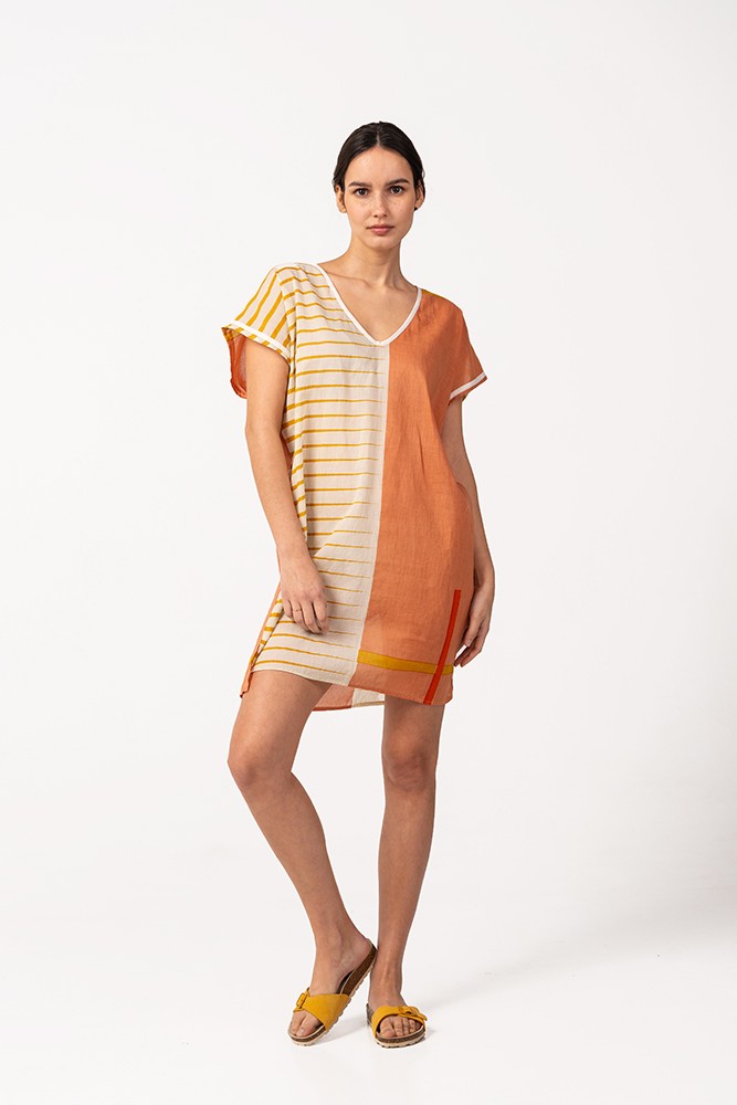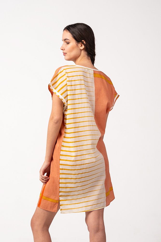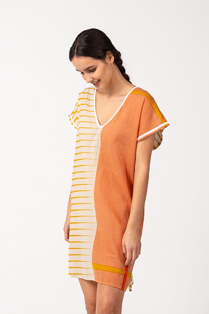 Baumwoll-Strandkleid mit geometrischem orangefarbenem Muster.